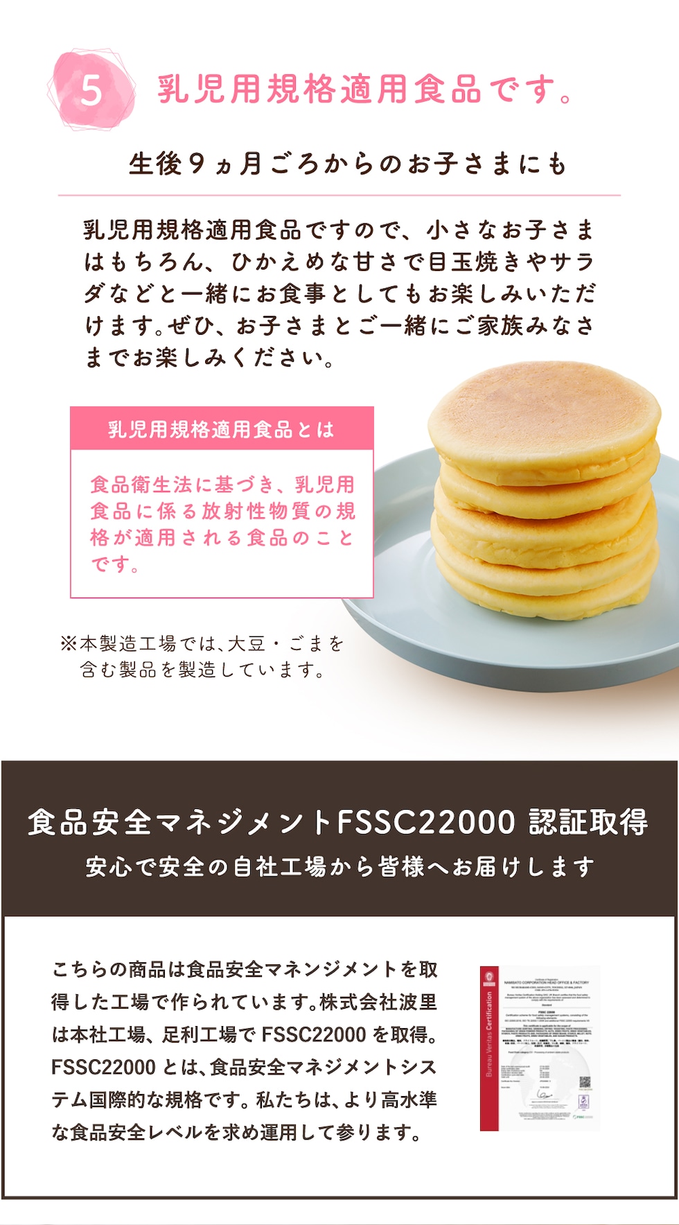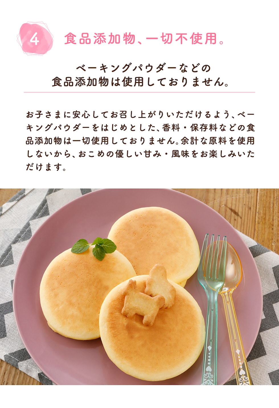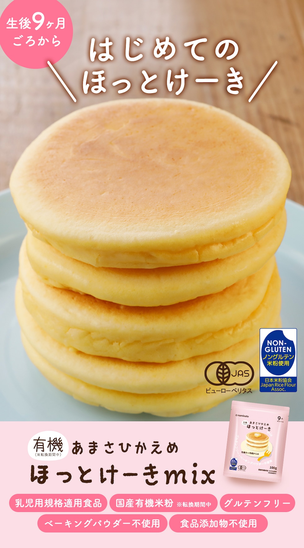 国産の有機米粉(※転換期間中)を使った小麦粉不使用・保存料不使用・香料不使用・着色料不使用のからだにやさしいホットケーキミックスです。甘さひかえめでお好みの素材と合わせてアレンジ自在、お野菜などと合わせて、果物などと合わせて、お食事にもどうぞ。有機原料にこだわり、食品添加物を一切使用しておりませんので毎日のおやつ、お食事におすすめです。小麦粉不使用で米粉のもっちり食感をお楽しみ頂けます。 ※本品は乳児用規格適用食品(食品衛生法に基づき、乳児用食品に係る放射性物質の規格が適用される食品)です。 ※「転換期間中有機農産物」は、「有機農産物」と同様に、認証を受けた生産者により有機的管理が行われた農産物です。(栽培方法は認証を受けた有機農産物と同じです)