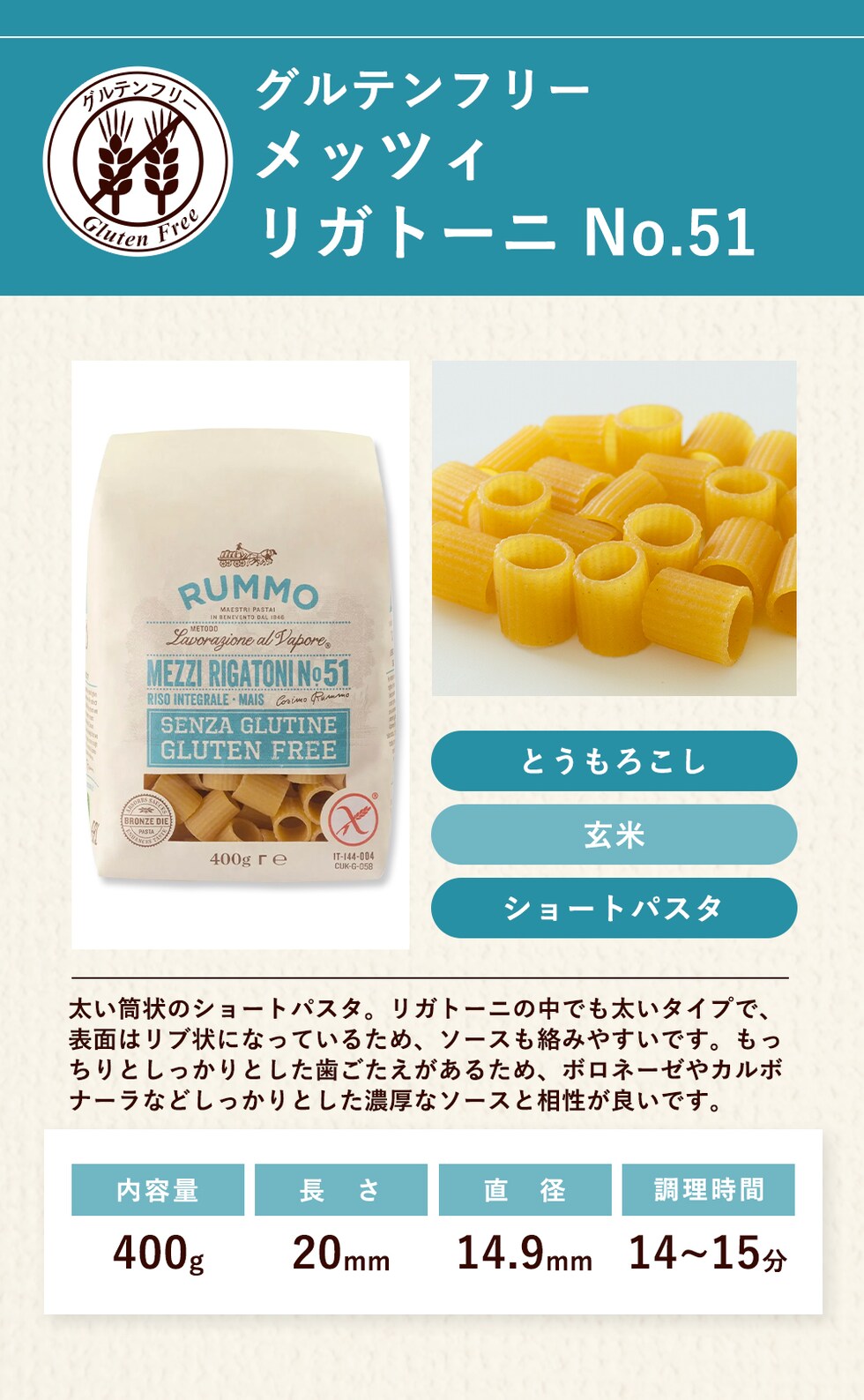 RUMMO グルテンフリー パスタ メッツィ リガトーニ No.51 400g おためし 小麦粉不使用 アレルギー 玄米 とうもろこし
