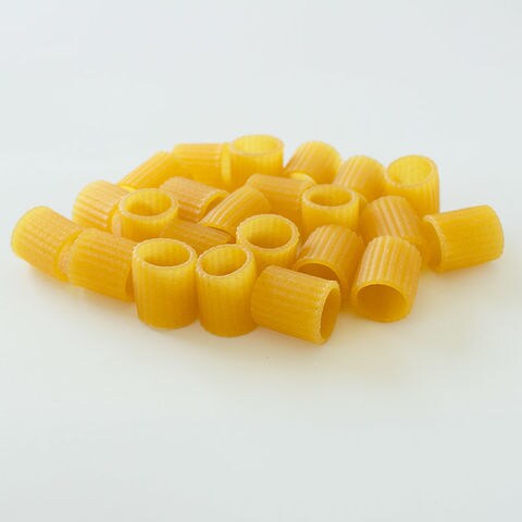 マカロニのように真ん中が空洞の、太い筒状のショートパスタ。リガトーニの中でも太いタイプ、ソースが絡みやすい表面がリブ状です。もっちりとしっかりとした歯ごたえがあるため、ボロネーゼやカルボナーラなどしっかりとした濃厚なソースと相性がよいです。内容量400g、長さ20mm、直径14.9mm、調理時間14~15分