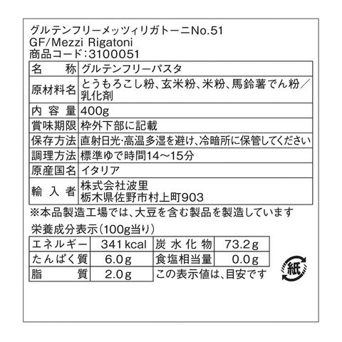 【グルテンフリー パスタ メッツィリガトーニ No.51】