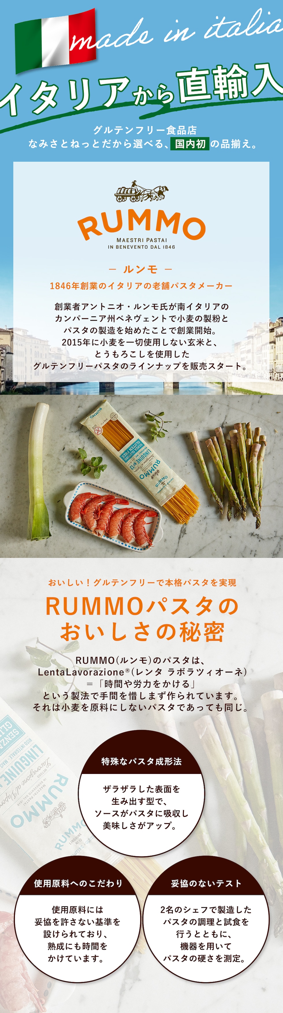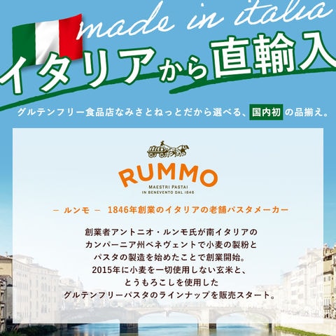 創業者アントニオ・ルンモ氏が南イタリアのカンパーニア州ベネヴェントで創業開始後、2015年に小麦を一切使用しない玄米ととうもろこしを使用したグルテンフリーパスタを販売。現在はヨーロッパはじめ世界各国の食卓で愛されている老舗パスタメーカーです。