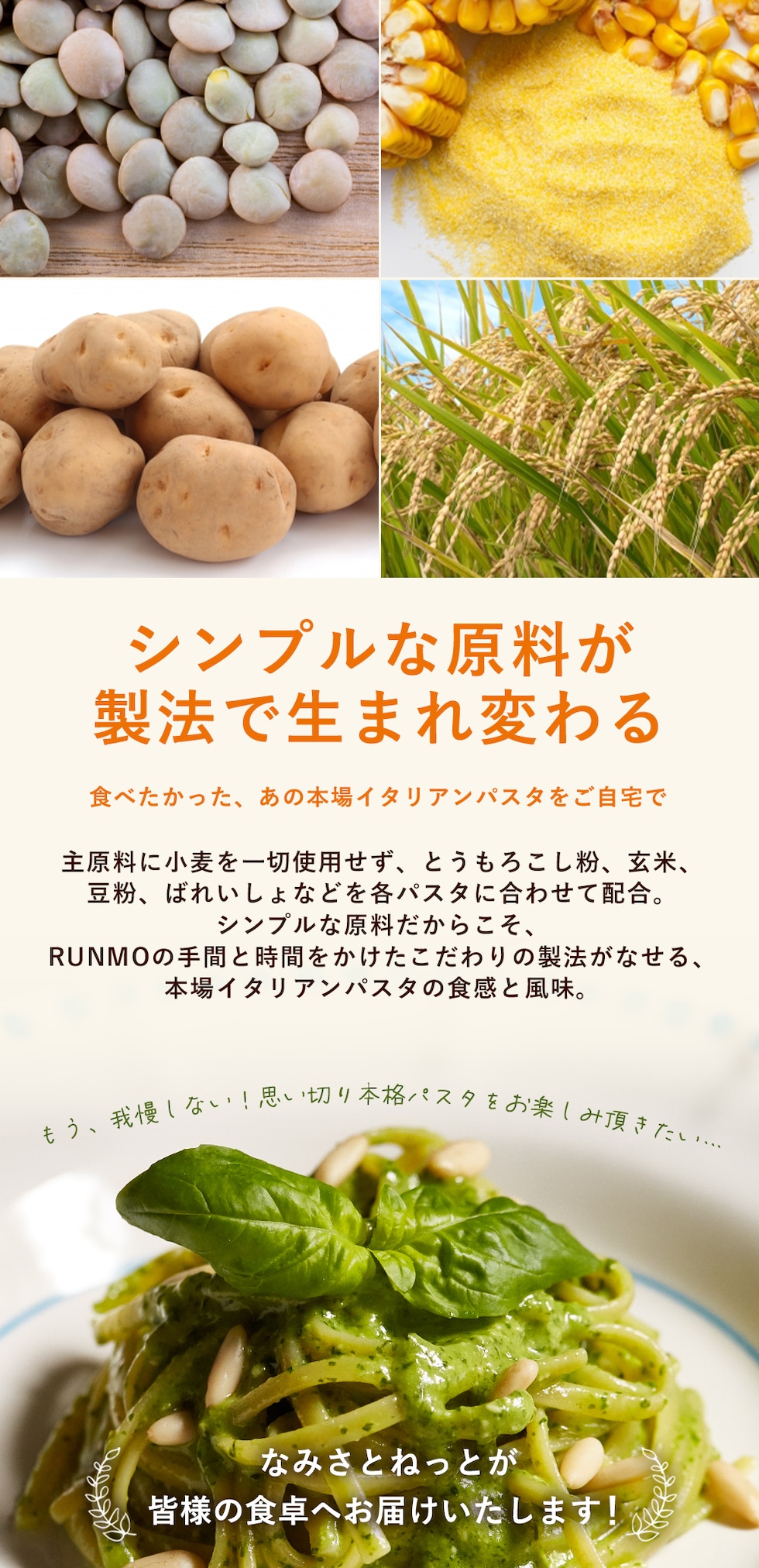 ・主原料に小麦を一切使用せず、とうもろこし粉、玄米、豆粉、ばれいしょなど各パスタにあわせてシンプルな原料を配合しています。