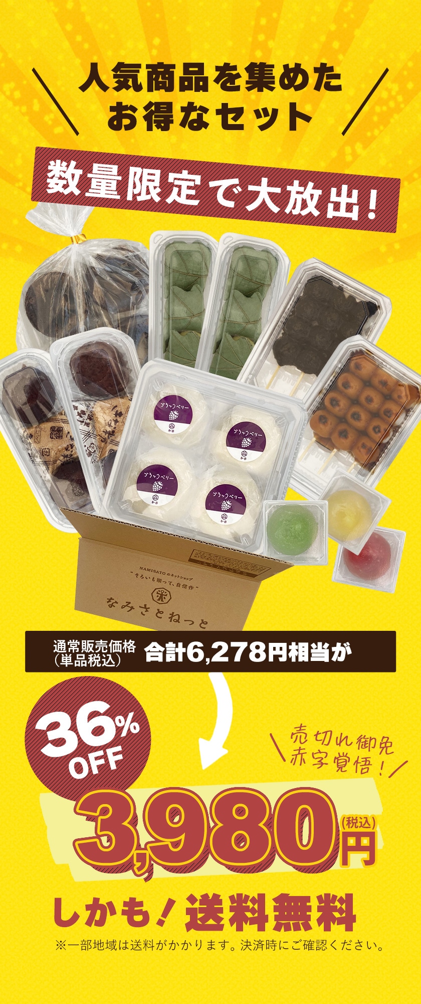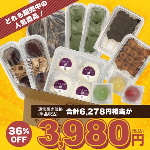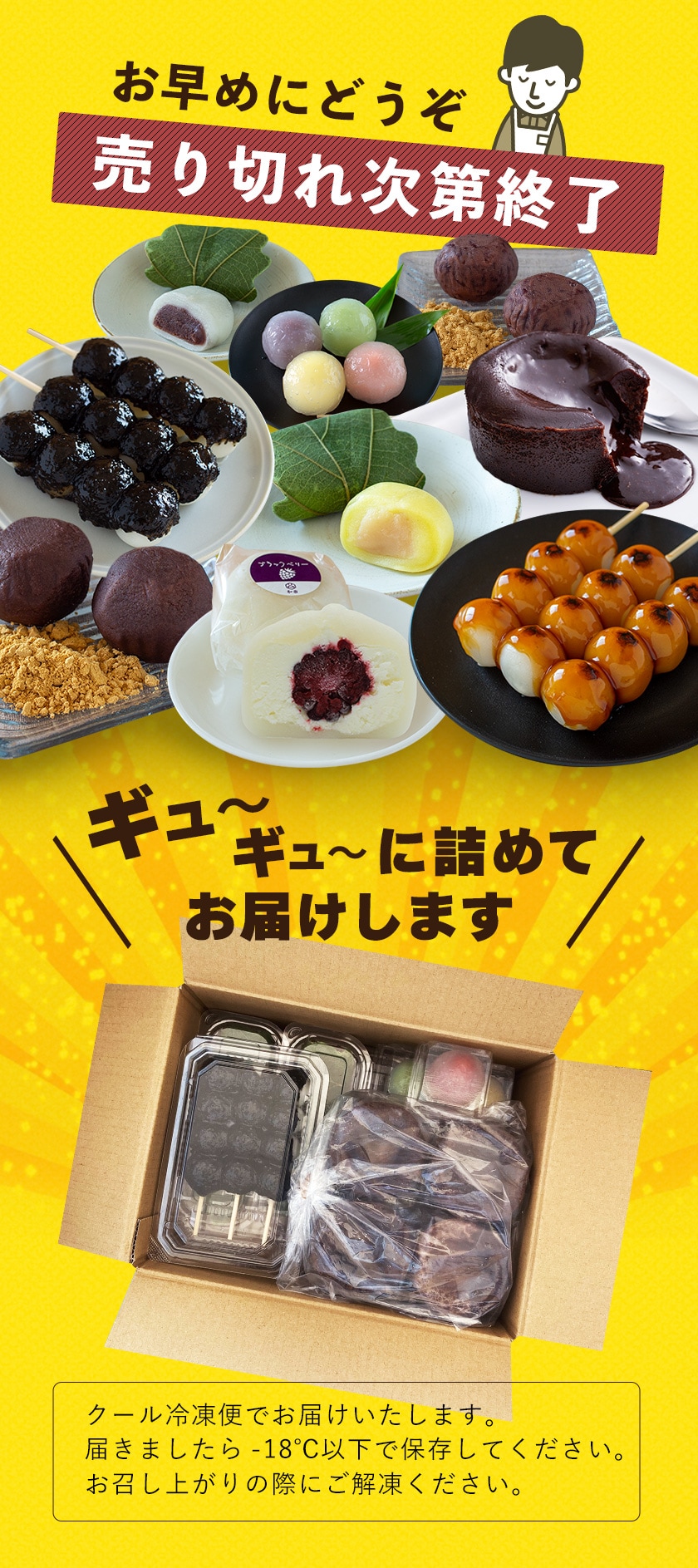当社菓子製造工場の和楽スイーツファクトリー人気スイーツをたっぷり詰め合わせた、お得な福袋セット。年末年始のだんらんやお茶請けにぴったりの豪華なセット!食べたいときに食べたい分だけ解凍できる冷凍便でお届けします。製法や原料にこだわった和菓子をメインにしたオンライン限定セット!米粉メーカーこだわりの、もっちもち食感のスイーツがたっぷり詰まったお得な福袋セットです。