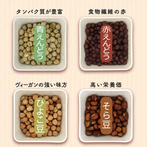 ・ひよこ豆、黄大豆、黒大豆、青大豆、紅大豆、青えんどう豆、赤えんどう豆、そら豆を贅沢ブレンド。