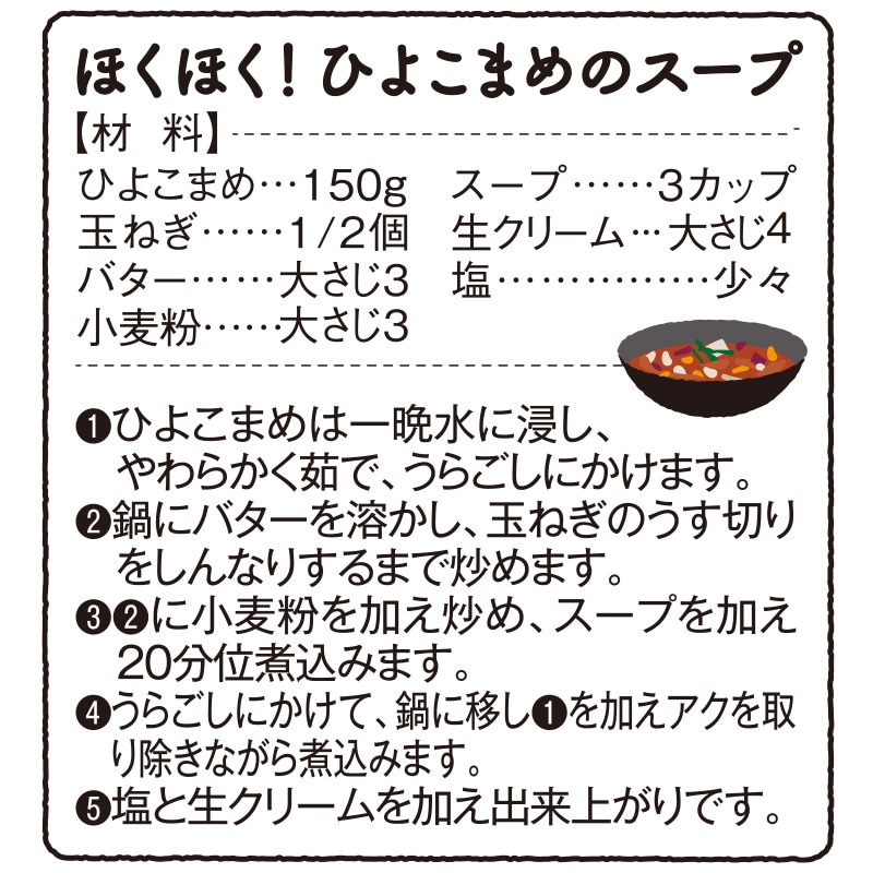 形がヒヨコの頭に似ていることから、命名されたと言われる「ひよこまめ」。煮くずれせず、幅広くご利用いただけます。