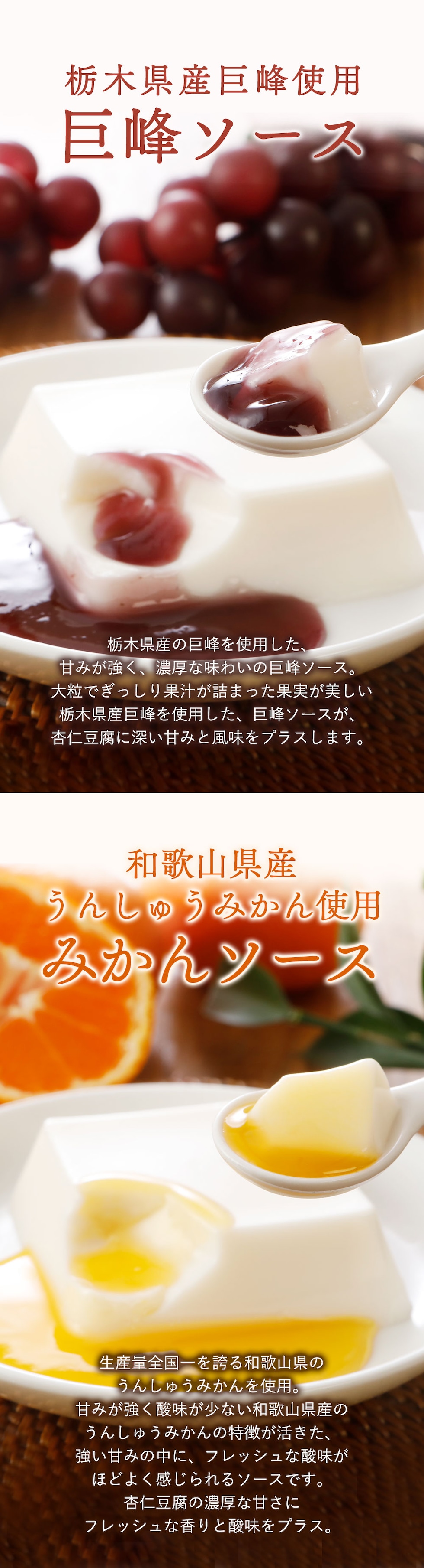 和楽の人気商品、杏仁豆腐のフルーツソース付きのギフトセット。栃木県産巨峰と、和歌山県産うんしゅうみかんを使用した2種類のフルーツソースがセットになっています。