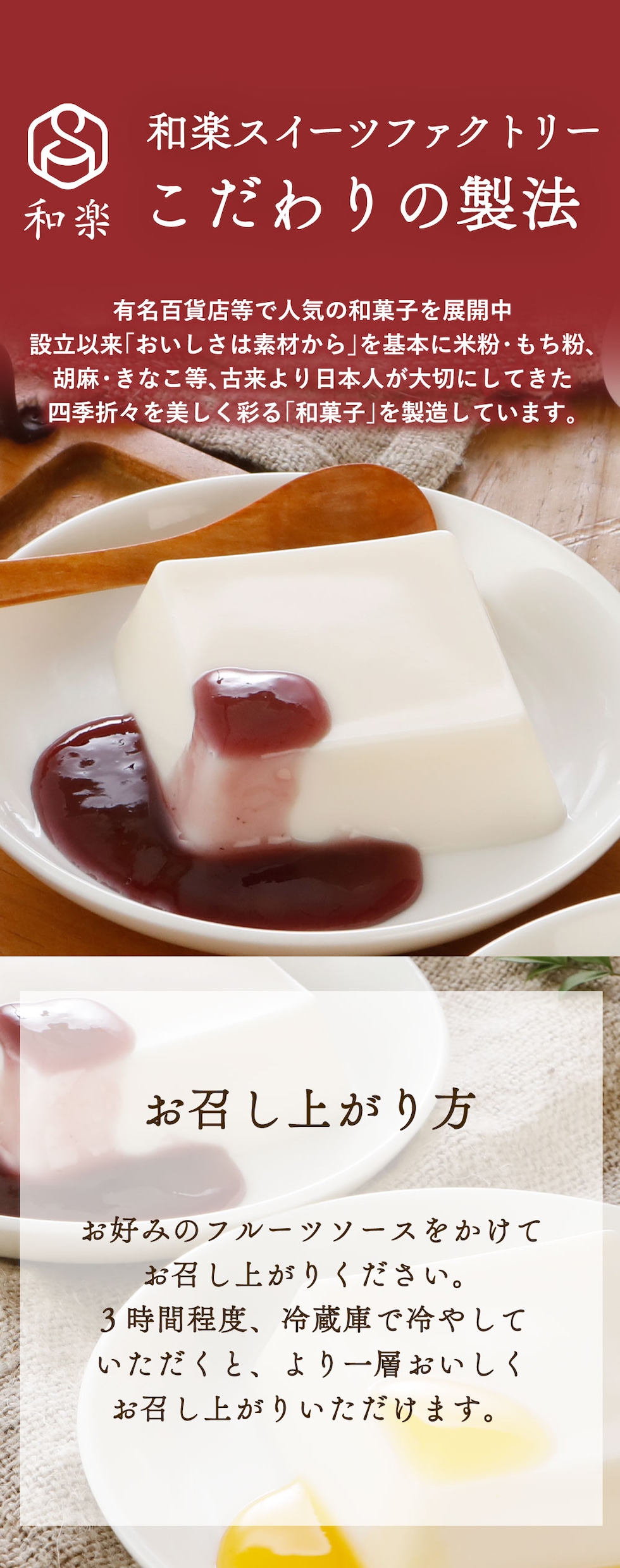 | 内容量 | 杏仁豆腐10個・フルーツソース2種類×各5個(10g) |