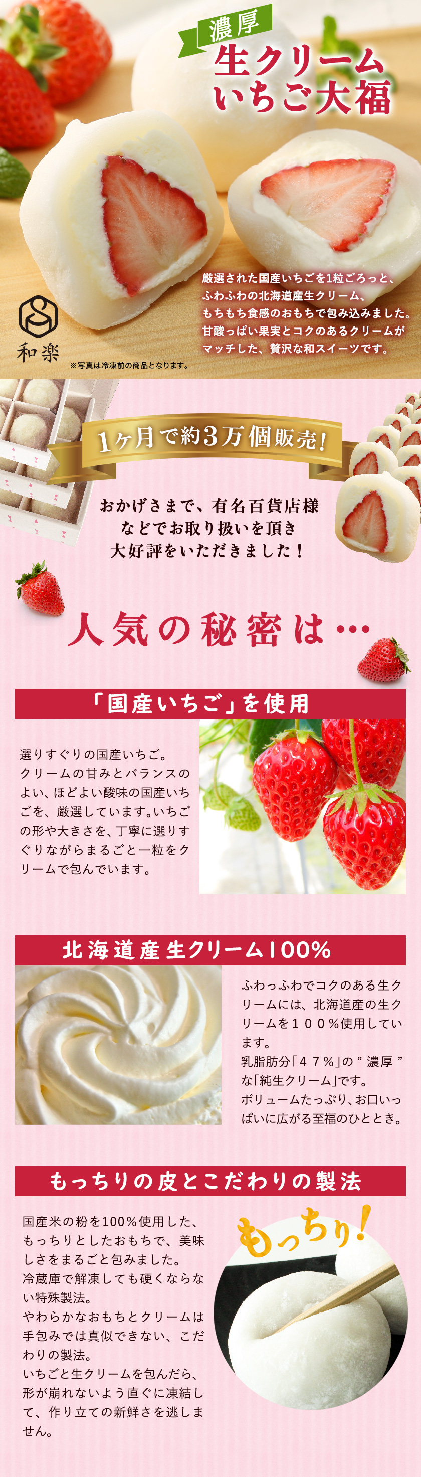 国産いちごを1粒ごろっと、ふわふわの北海道生クリーム、もちもち食感のおもちで包み込みました。甘酸っぱい果実とコクのあるクリームがマッチした、贅沢な和スイーツです。1ヶ月で約3万個販売!おかげさまで、有名百貨店様などでお取扱いを頂き、大好評をいただきました。「いちご王国」栃木県。クリームの甘さとバランスのとれた、ほどよい酸味の国産いちごのみを使用。北海道産生クリーム100%、ふわっふわでコクのある生クリームには、北海道産の生クリームを100%使用しています。乳脂肪分「47%」の濃厚な「純生クリーム」です。ボリュームたっぷり、お口いっぱいに広がる至福のひととき。もっちりの皮とこだわりの製法。国産米の粉を100%使用した、もっちりとしたおもちで美味しさをまるごと包みました。冷蔵庫で解凍しても硬くならない特殊製法。大福?アイス?不思議なスイーツ。大福のやわらか食感でありながら、アイスのようなひんやりとした口あたり。新鮮な果実が食べる人に癒しと小さな幸せをお届けします。