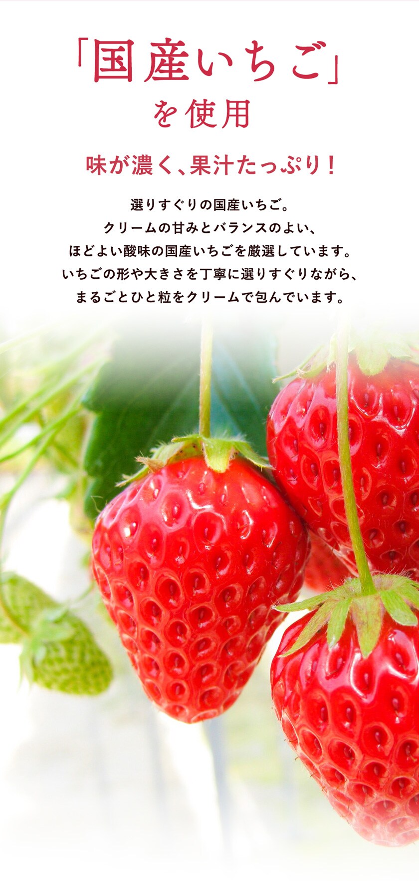 期間限定の特別ないちごクリーム大福。国産いちごを1粒ごろっと、ふわふわの北海道生クリーム、もちもち食感のおもちで包み込みました。甘酸っぱい果実とコクのあるクリームがマッチした、贅沢な和スイーツです。 1ヶ月で約3万個販売!おかげさまで、有名百貨店様などでお取扱いを頂き、大好評をいただきました。