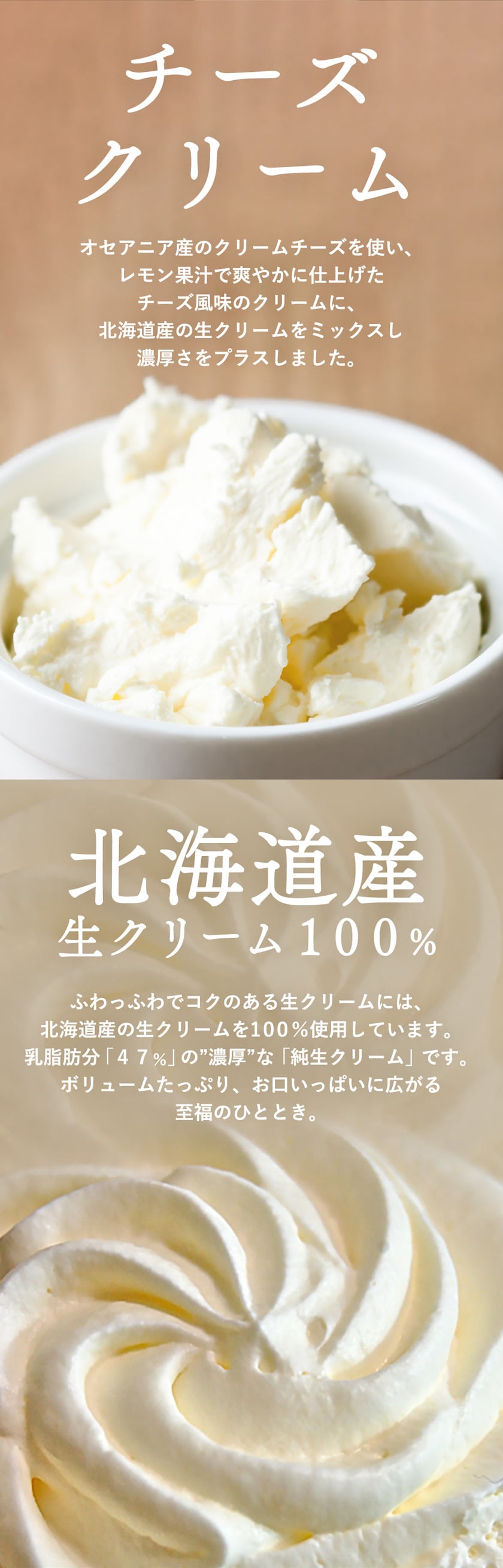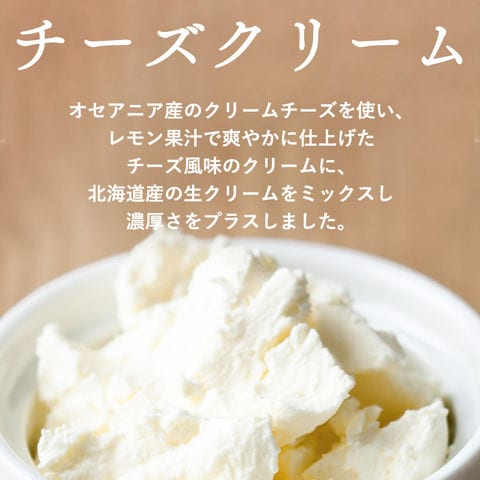 北海道産生クリーム100%、ふわっふわでコクのある生クリームには、北海道産の生クリームを100%使用しています。乳脂肪分「47%」の濃厚な「純生クリーム」です。またオセアニア産のクリームチーズを贅沢に使用し、レモン果汁で爽やかに仕上げたチーズクリームもご用意。ボリュームたっぷり、お口いっぱいに広がる至福のひととき。 もっちりの皮とこだわりの製法。もっちりとしたおもちで美味しさをまるごと包みました。冷蔵庫で解凍しても硬くならない特殊製法。