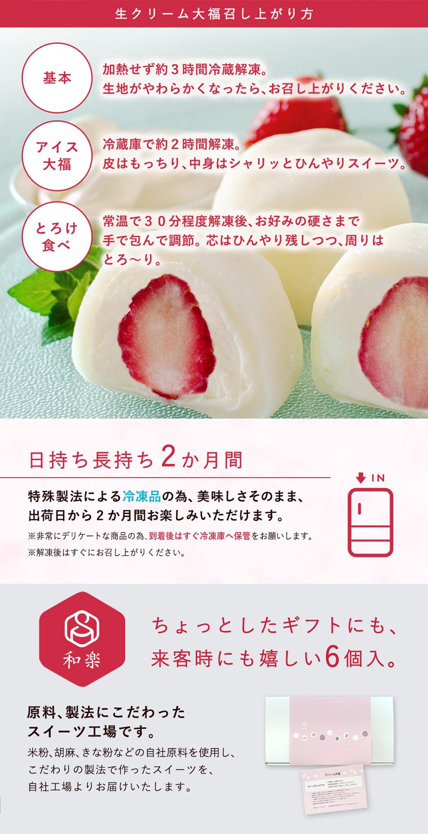 | 内容量 | 6個(生クリーム大福いちご3個、チーズクリーム大福いちご3個) |