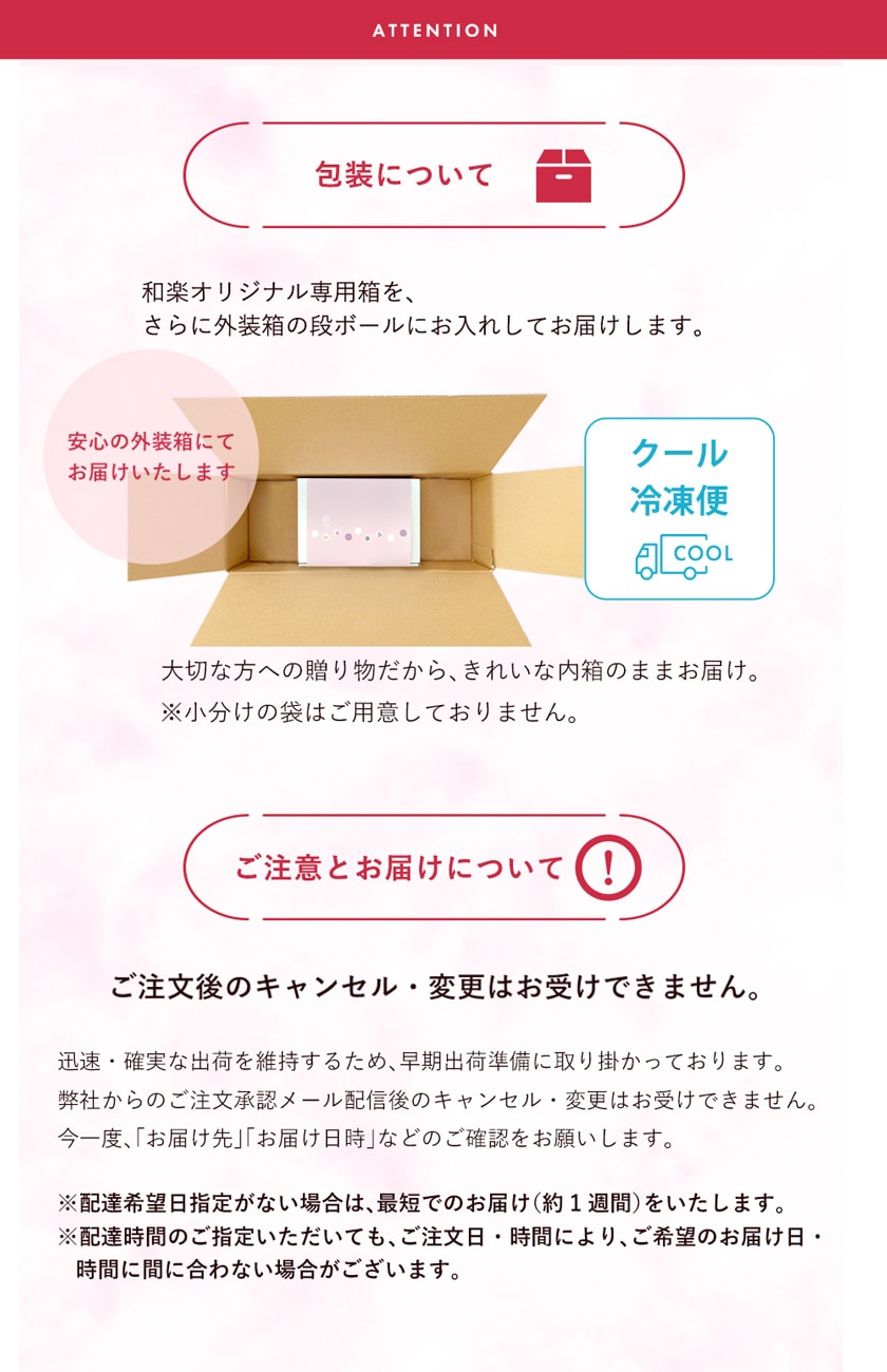 | 保存方法 | 冷凍庫での保管、【解凍方法】冷蔵庫で約2~3時間 |
