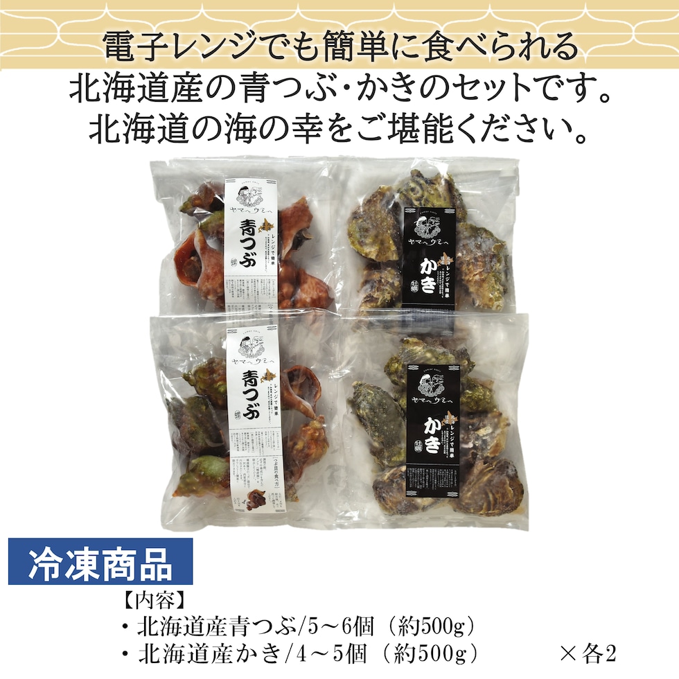 〇重 量:北海道産青つぶ/5~6個(約500g)・北海道産かき/4~5個(約500g)×各2