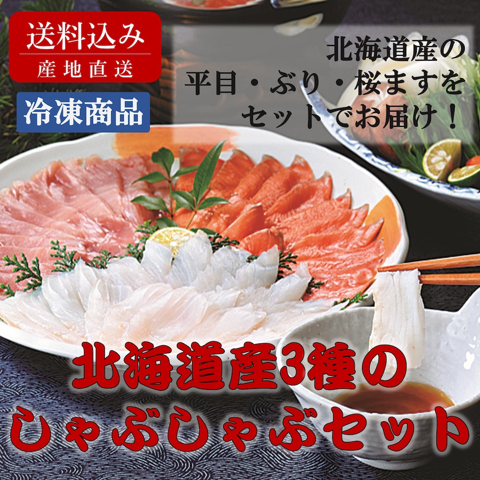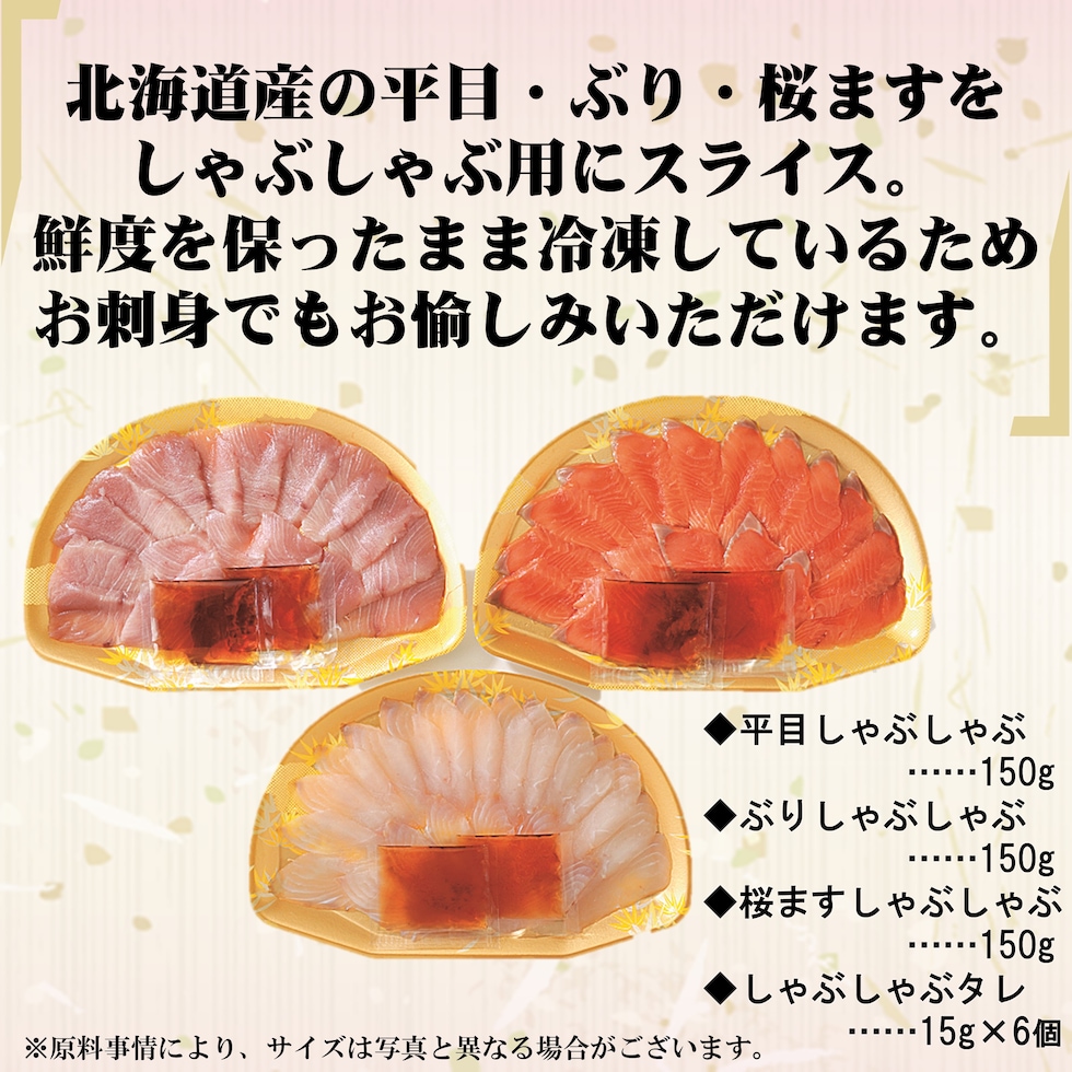 北海道産の平目・ぶり・桜ますをしゃぶしゃぶ用にスライスしました。鮮度を保ったまま冷凍しているため、お刺身でもお愉しみいただけます。