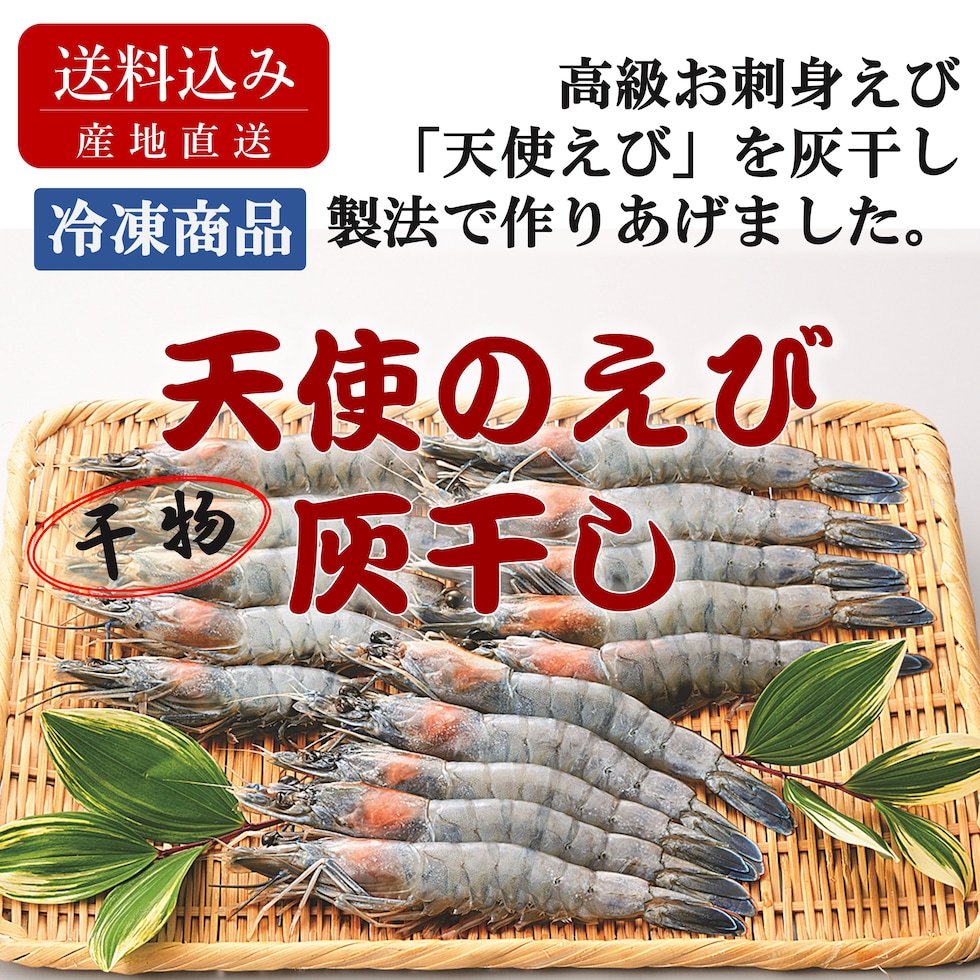 高級お刺身えびで知られる「天使のえび」を登別で採集された火山灰を使い、灰干し製法で作り上げました。上質な甘みと弾力のある歯ごたえがほかのえびとは一味違います。灰干しで旨味が凝縮しているので、焼いて良し、素揚げで良し、てんぷらでも良し、いろいろな料理で楽しめます。