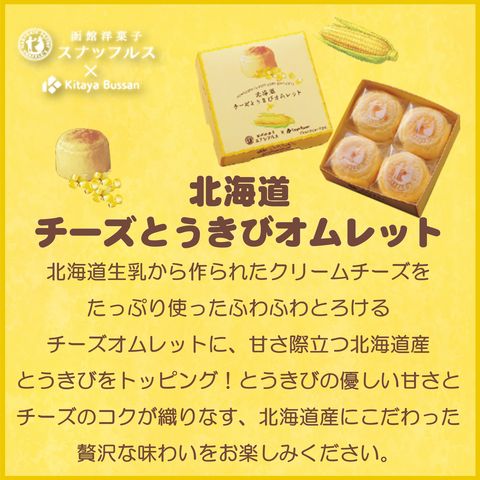 【セット商品(送料込)】<函館洋菓子「スナッフルス」と「キタヤ物産」のコラボスイーツ> 北海道チーズとうきびオムレット(4個入×2箱セット) ◆要冷凍◆ ※他商品との同梱不可※