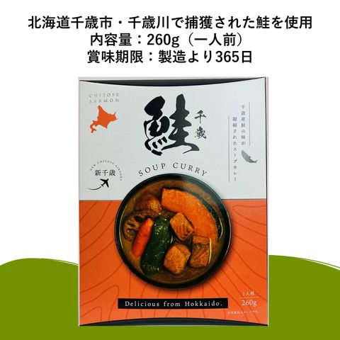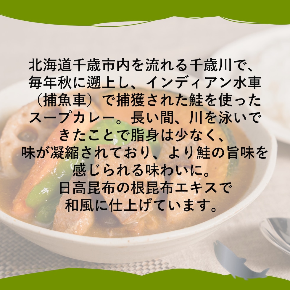 北海道千歳市内を流れる千歳川で毎年秋に遡上し、インディアン水車(捕魚車)で捕獲された鮭を使ったスープカレー。長い間、川を泳いできたことで脂身は少なく、味が凝縮されており、より鮭の旨味を感じられる味わいに。北海道産玉ねぎ、じゃがいもを使用し、日高昆布の根昆布エキスで和風に仕上げています。
