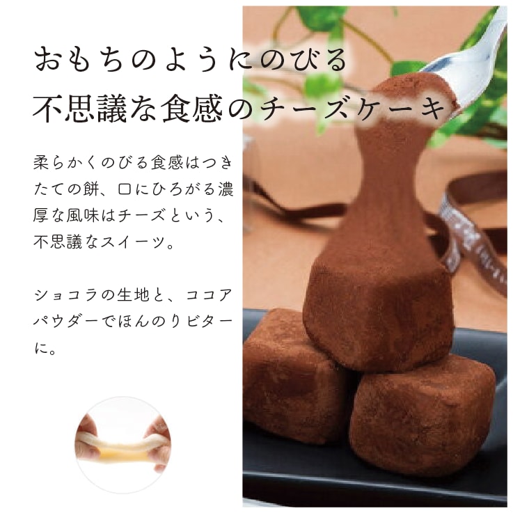 大人気商品おもっちーずのしょこら味!外側はチョコレート味、内側はプレーンの2層構造仕上げにココアをたっぷりふりかけた本製品も幅広く好評いただいてます。