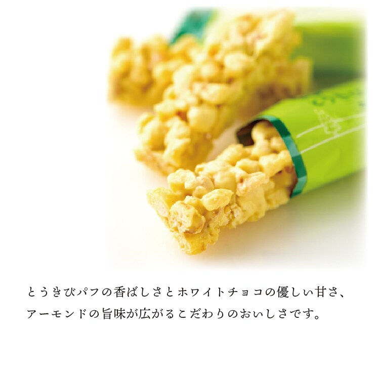 とうきびパフの香ばしさとホワイトチョコの優しい甘さ、アーモンドの旨味が広がるこだわりのおいしさです。