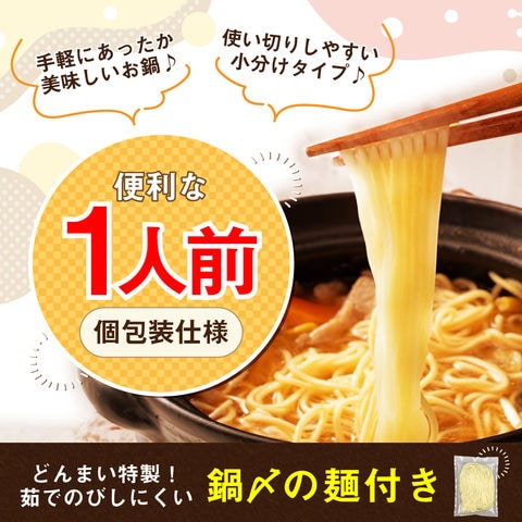 【台湾旨辛火鍋】麺90g(1食)×1袋、スープ39g×2袋 【あご塩鍋】麺90g(1食)×1袋、スープ30g×2袋 【コク旨まぐろ鍋】麺90g(1食)×1袋、スープ45.8g×2袋 【ユッケジャン鍋】麺90g(1食)×1袋、スープ33g×2袋 【濃厚旨味噌鍋】麺90g(1食)×1袋、スープ40g×2袋 【黄金塩スープ鍋】麺90g(1食)×1袋、スープ32g×2袋 【こってり背脂豚骨醤油鍋】麺90g(1食)×1袋、スープ29.7g×2袋 【マー油入りクリーミー豚骨鍋】麺90g(1食)×1袋、スープ30g×2袋 ※商品画像は調理イメージです。具材はセット内容に含まれません。 お好みの具材を合わせてお楽しみください。 |