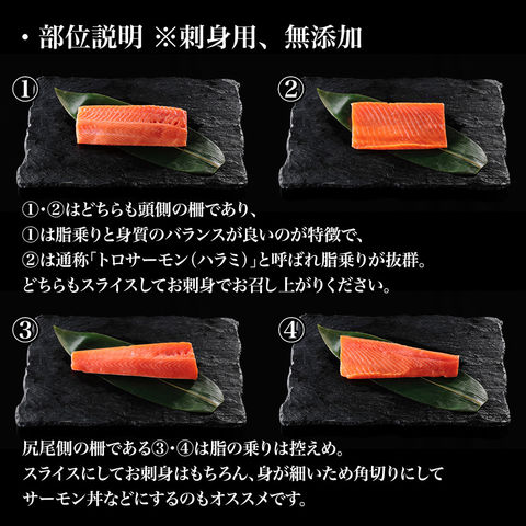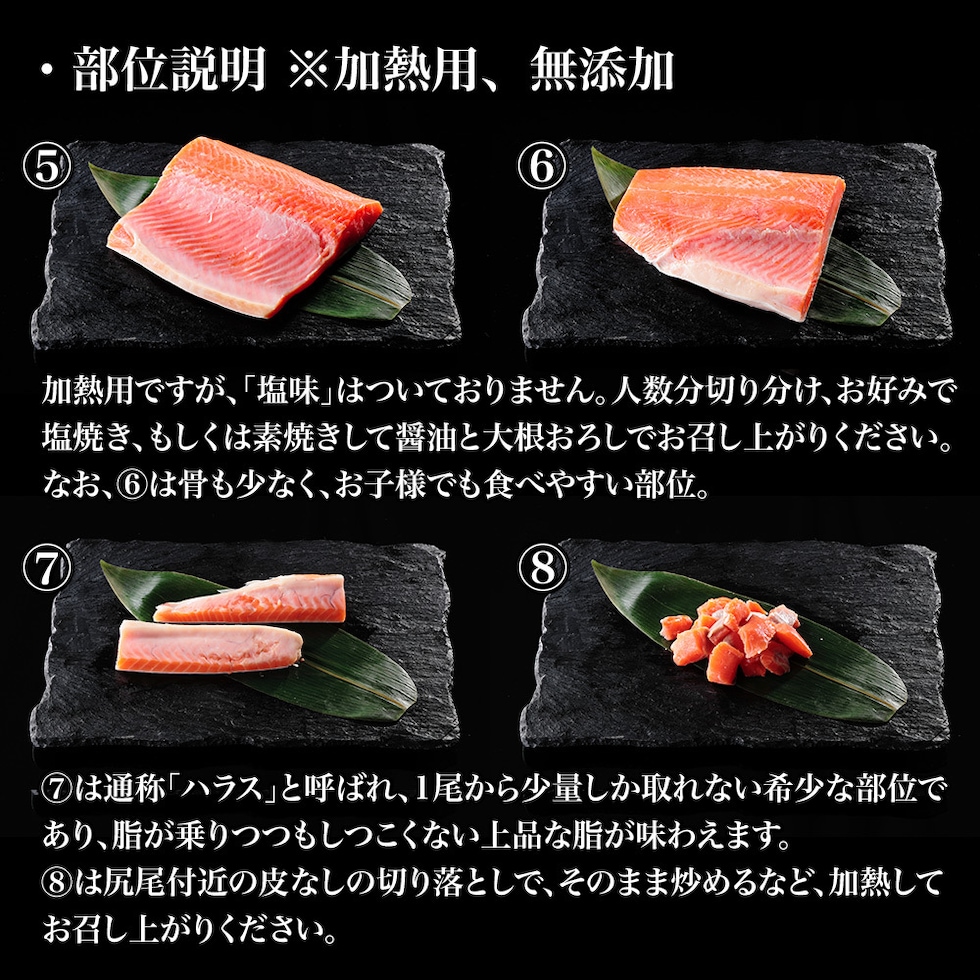 | 内容量 | 1.背頭×1柵 2.腹身(ハラミ)×1柵 3.背尾×1柵 4.腹尾×1柵 5.切身A×1切 6.切身B×1切 7.ハラス×2本 8.切落し80g |