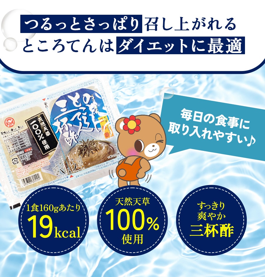 天草から造り上げたのどごしの良いところてんの三杯酢味です。低カロリー、低糖質なので、健康を気にする方やダイエット中の方にもぴったり。暑い季節や食事をさっぱりしたいときにも最適です。ところてんは便秘解消や腸内環境の改善にも役立つ食物繊維を豊富に含んています。