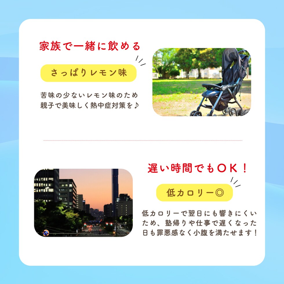 | 水分補給にぴったりのレモン味のゼリー飲料がビタミンC入りの栄養機能食品となってリニューアルしました!汗をかいた時、寝込んだ時の水分補給が片手で簡単にできます。暑い夏の熱中症対策にもおすすめです。 |