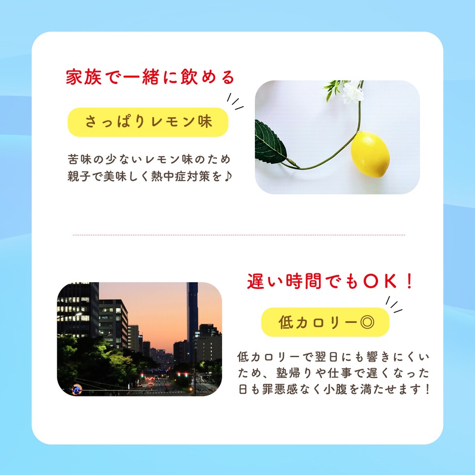 | 水分補給にぴったりのレモン味のゼリー飲料がビタミンC入りの栄養機能食品となってリニューアルしました!汗をかいた時、寝込んだ時の水分補給が片手で簡単にできます。暑い夏の熱中症対策にもおすすめです。 |