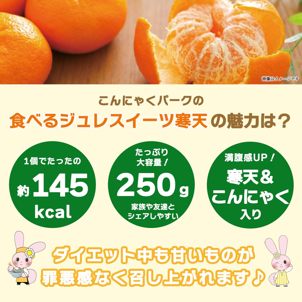 | ヘルシーなこんにゃく粉と寒天入りの新食感デザート「食べるジュレスイーツ寒天」のみかん味。みんなでシェアできるたっぷり250gの大容量サイズです。 |