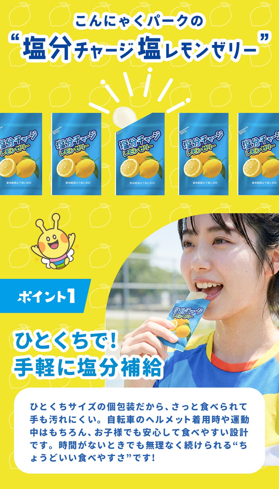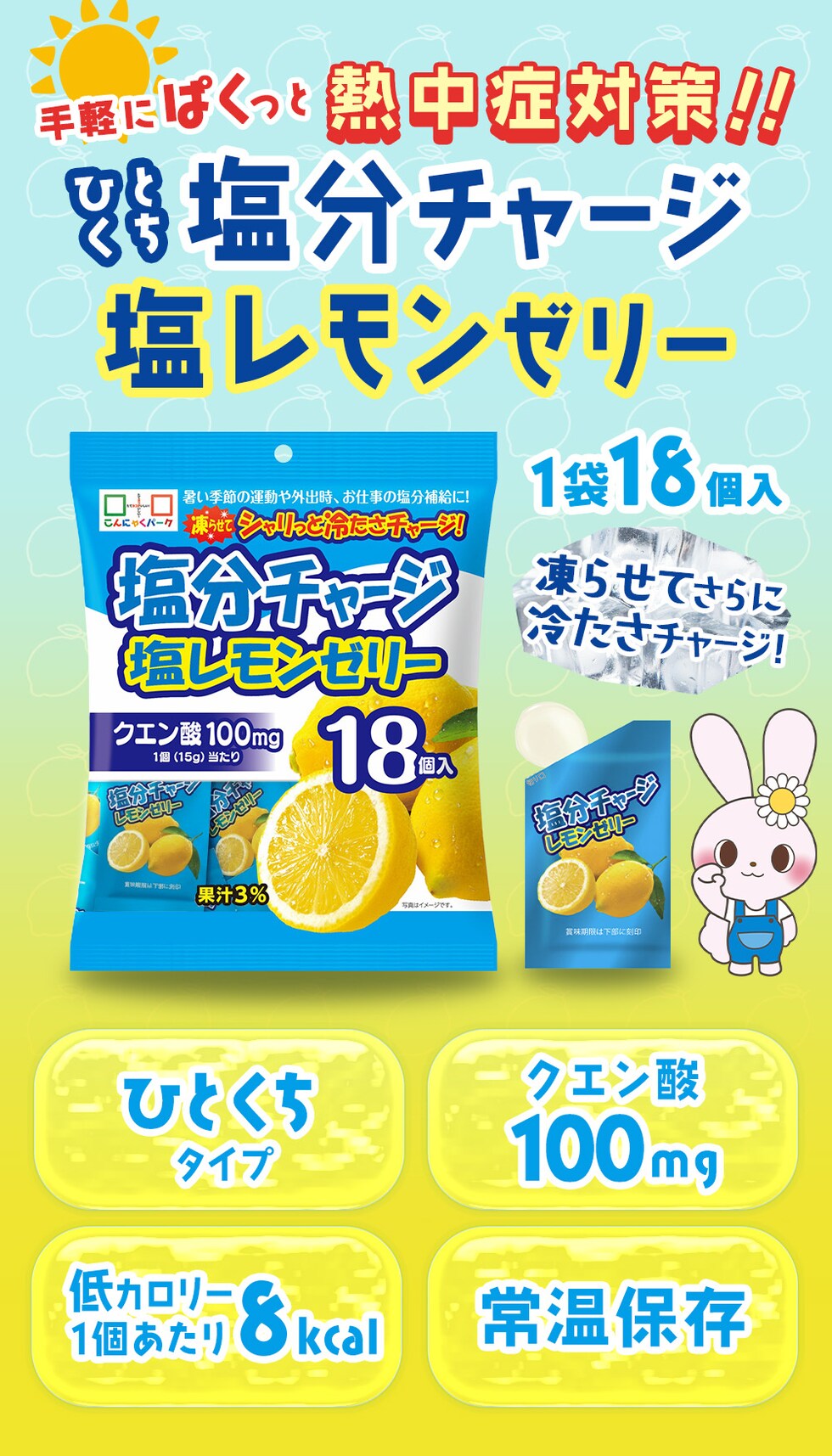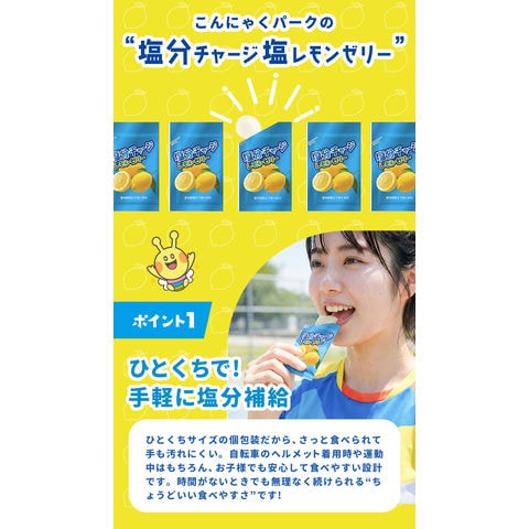 熱中症対策 凍らせてもおいしい! 塩分チャージ塩レモンゼリー 塩分補給 夏限定 こんにゃくパーク まとめ買い パウチ 個包装タイプ ひとくちゼリー ゼリー ヨコオデイリーフーズ (1袋18個入*12袋)