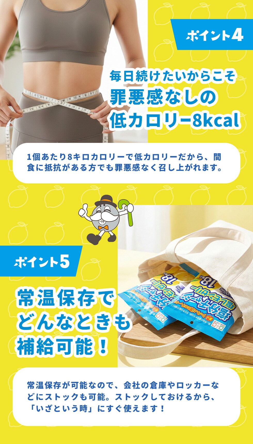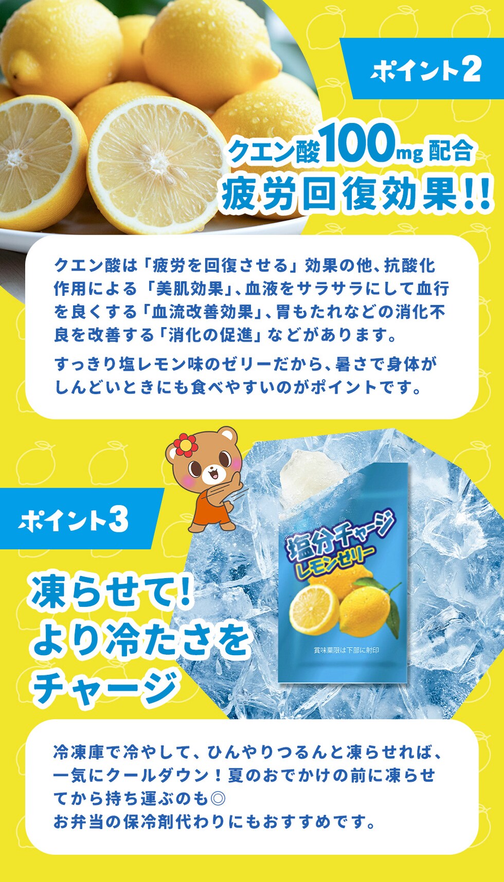 名称 |塩分チャージ塩レモンゼリー 18個入り 原材料名 |果糖ぶどう糖液糖(国内製造)、食塩、レモン果汁 / グリシン、酸味料、ゲル化剤(増粘多糖類、寒天)、クエン酸K、pH調整剤、香料、甘味料(スクラロース、アセスルファムK) 栄養成分 |【個包装1個(15g)あたり】エネルギー:8Kcal、たんぱく質:0.1g、脂質:0.0g、炭水化物:2.0g(糖質:1.9g、食物繊維:0.1g)、食塩相当量:0.11g、カリウム:29.7mg、クエン酸:100mg 内容量 |18個入(1個15g) ×12袋 賞味期限 |製造日より1年 保存方法 |直射日光、高温の場所を避けて保存してください 製造者 |株式会社 ヨコオデイリーフーズ |
