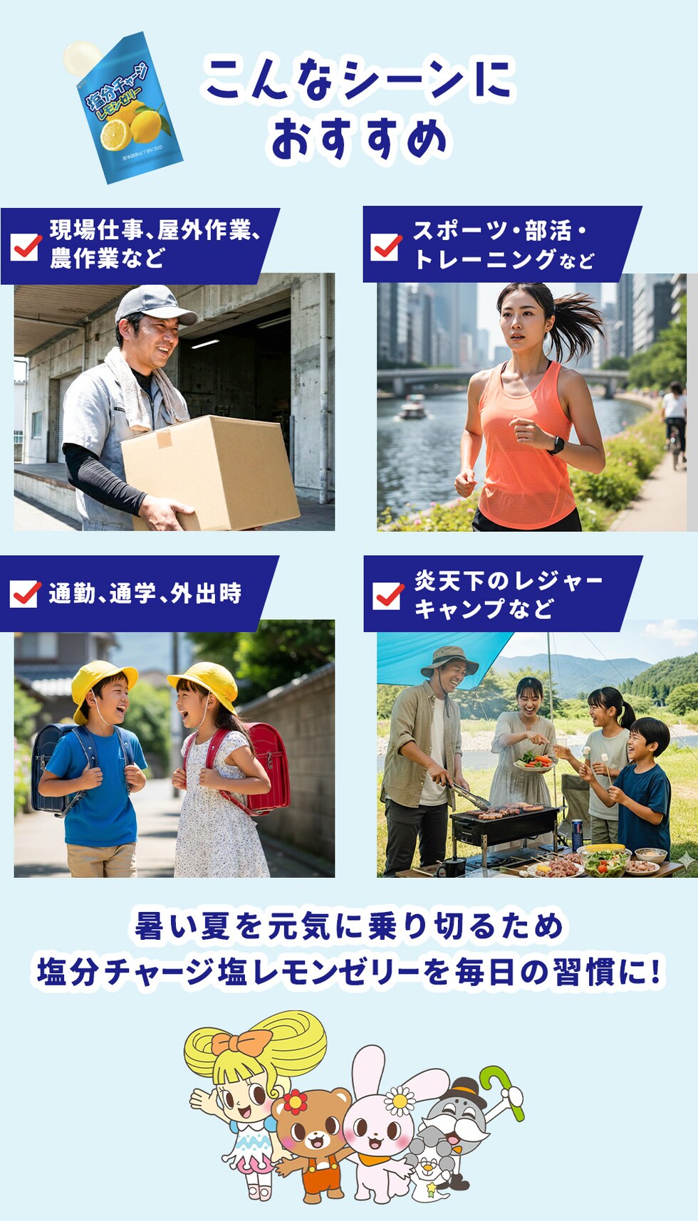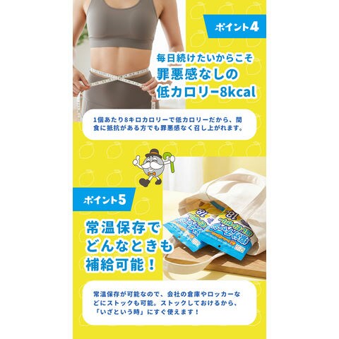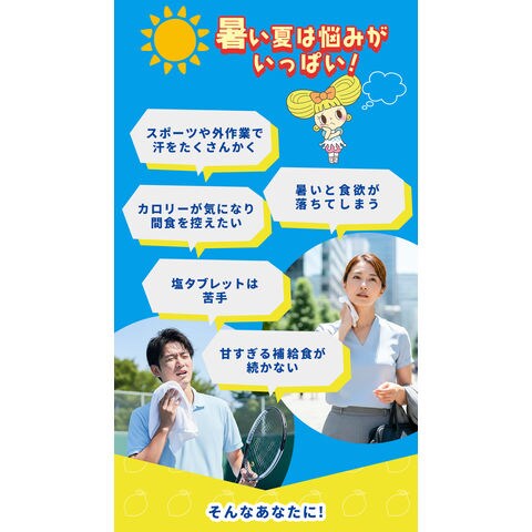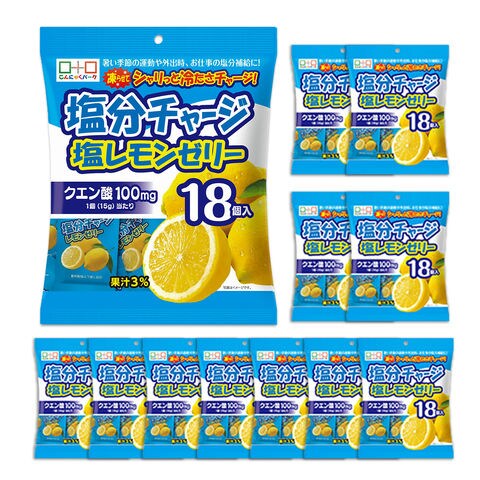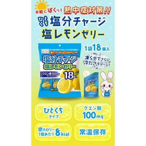 | 暑い季節の運動や外出時、屋外の現場作業や農作業時などで塩分補給に便利な個包装タイプの塩分チャージ塩レモンゼリー。こちらは1袋18個入り。塩分補給にぴったりなクエン酸、カリウム入り。常温保存ができるから、まとめ買いをしてもいつでも使用できるようにストックが可能です。凍らせれば、塩分と冷たさを同時にチャージができ、熱中症対策にぴったりです! |