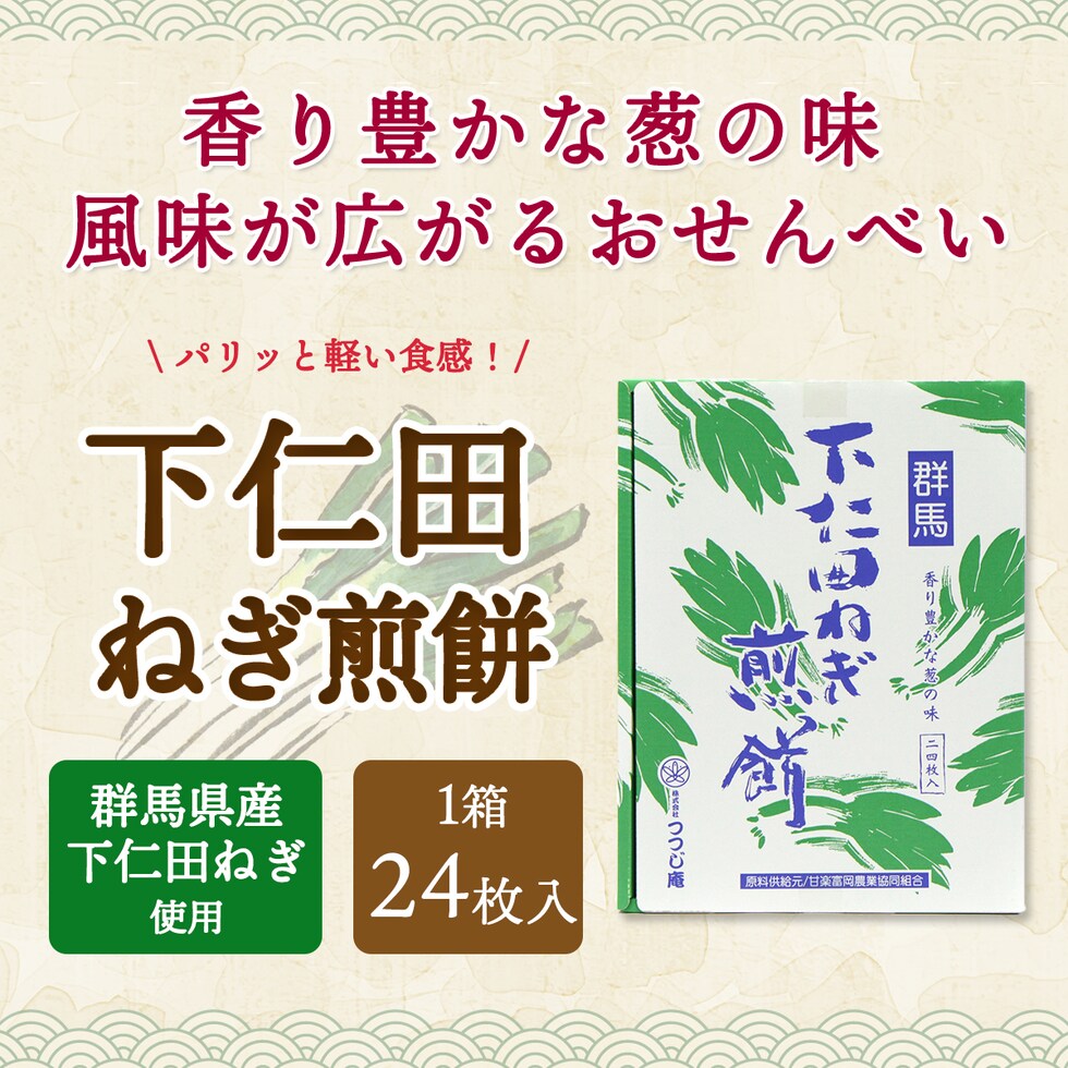 | 群馬の名産を気軽に味わって欲しいという思いを込めて作られた下仁田ねぎ煎餅。お子様から大人まで幅広い世代で召しあがれる葱の風味の広がる一品です。 |
