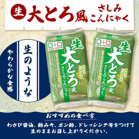 こんにゃくパーク独自の製法で生大とろ風に造り上げた生のようなやわらかな食感のさしみこんにゃくです。スライスカットまたはサイコロカットにして、わさび醤油、酢みそ、ポン酢、ドレッシング等をつけて生のままお召し上がりください。 |