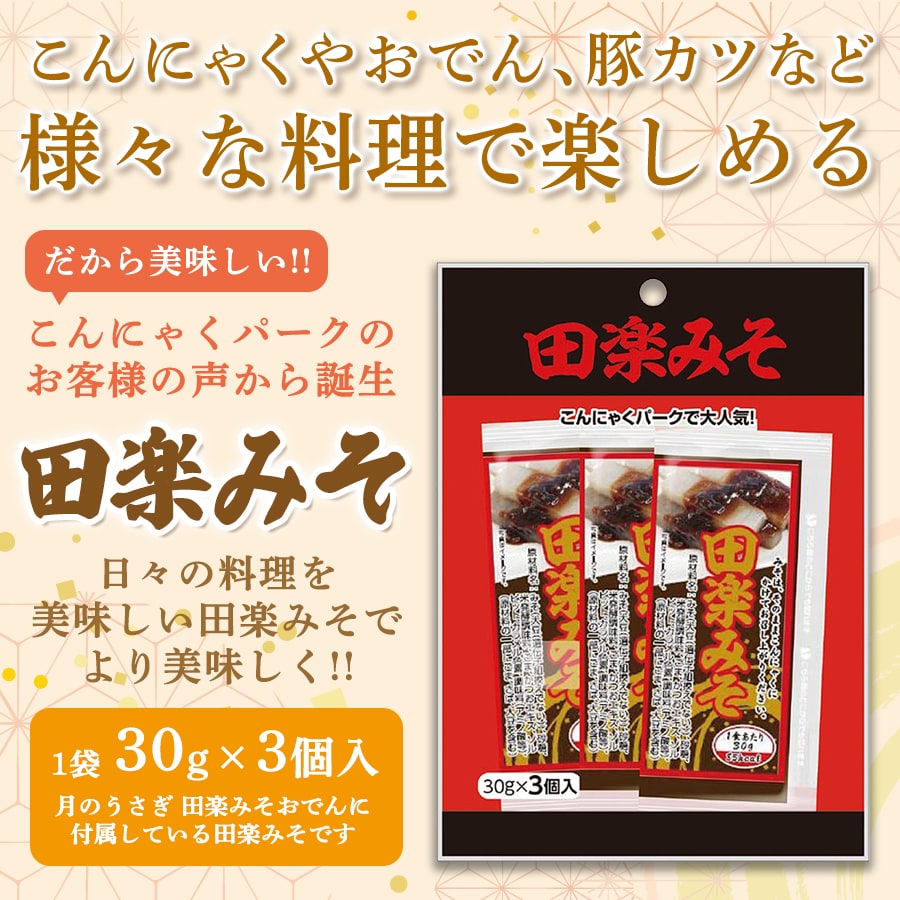 「月のうさぎ 田楽みそおでん」に付属しているごまがたっぷり入った田楽みそ(1袋3個入)です。こんにゃくパークご来場のお客様からの反響が大きく単品での販売を開始しました! こんにゃく、焼きなす、里芋、もち、豆腐、とんかつ、おでんなどの様々な料理ににそのままかけてお召し上がりいただけます。