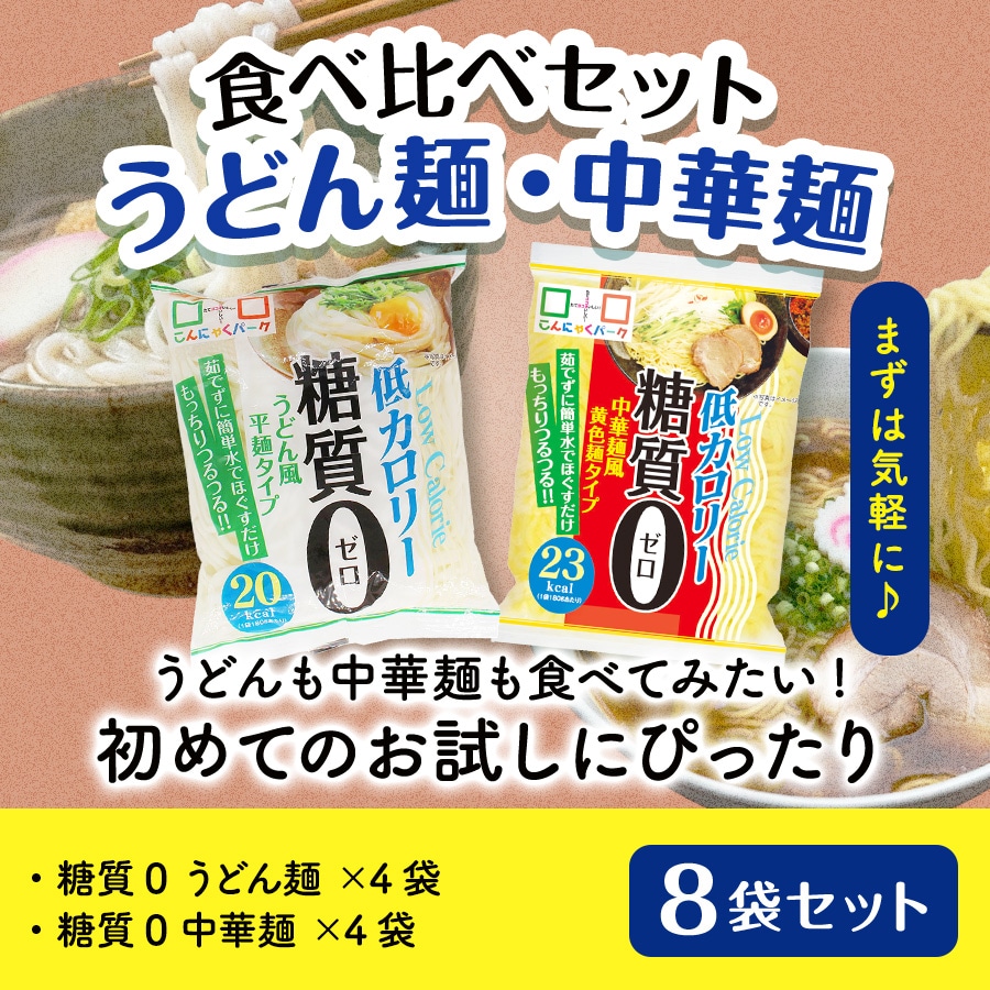 | こんにゃくパークの人気商品「糖質0麺 うどん風平麺タイプ」「糖質0麺 中華麺風黄色麺タイプ」の食べ比べセットです。糖質0かつ低カロリーで日々の食事をヘルシーに楽しめます。 |