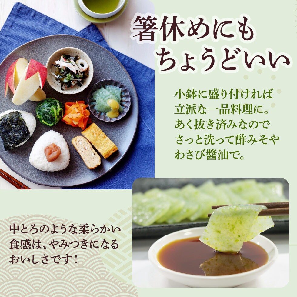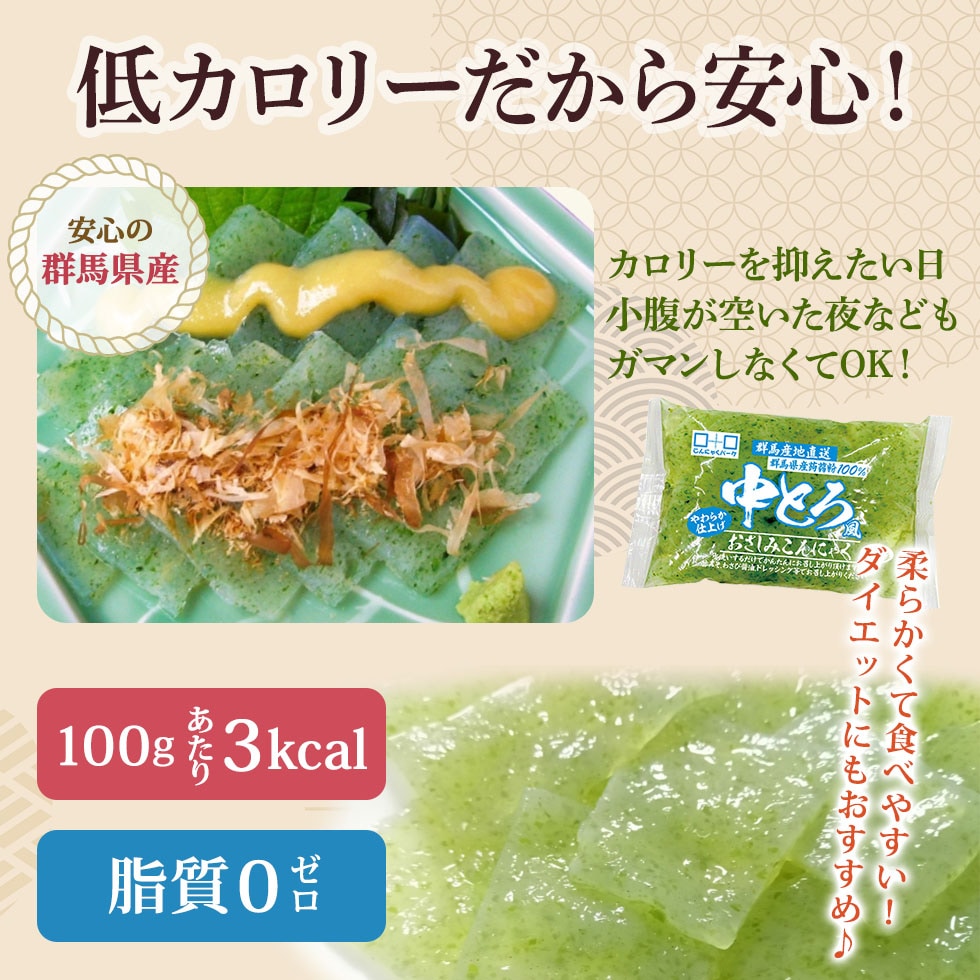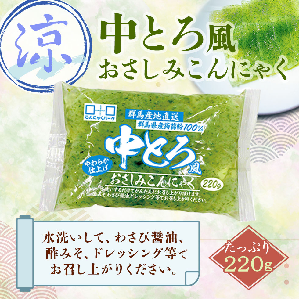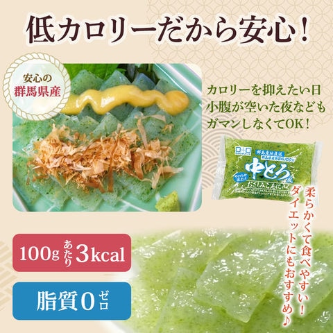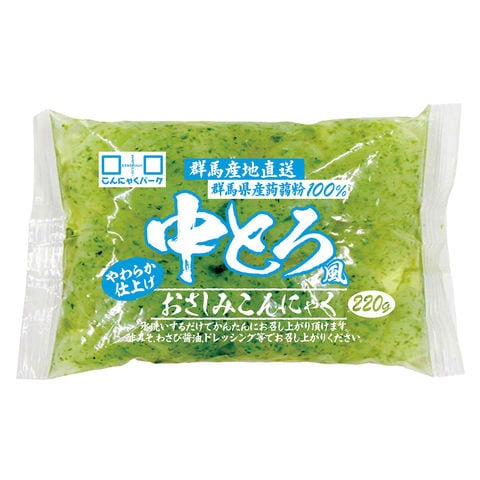 群馬県産こんにゃく特等粉を100%使用し、非常にやわらかく造り上げた、あおさ海苔使用の中とろ風のおさしみこんにゃくです。あく抜き済みなので、水洗いして、酢みそ、わさび醤油、ドレッシング等でお召し上がりください。 |