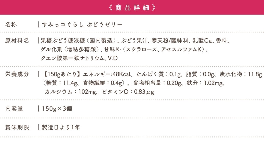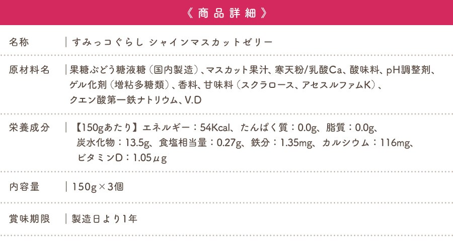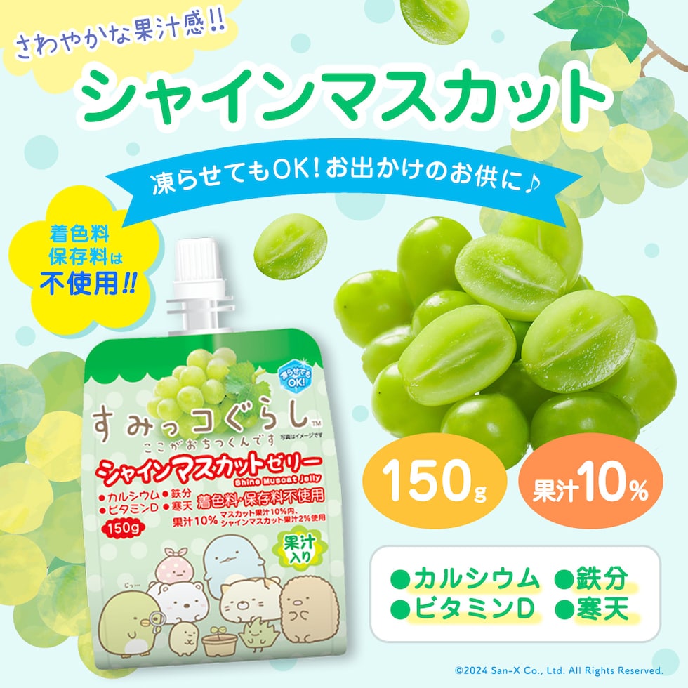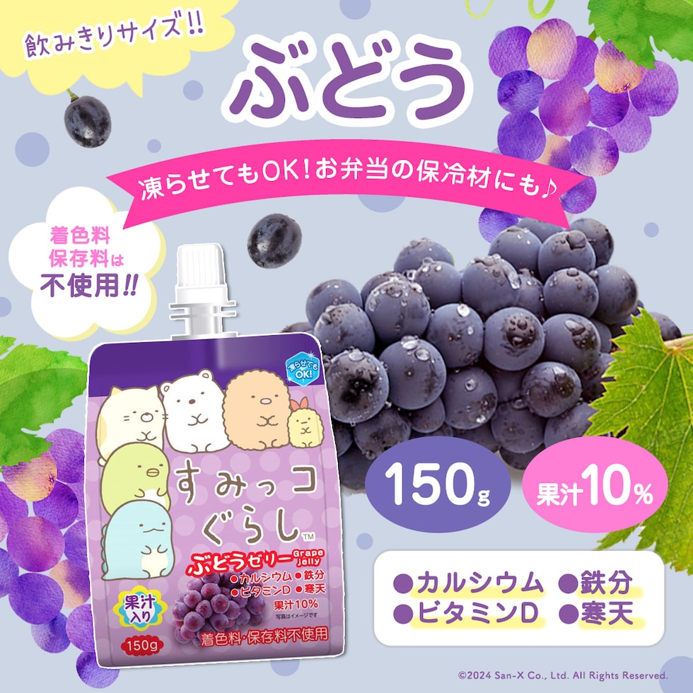 | 大人気のキャラクター「すみっコぐらし」の果汁入り飲むゼリーの詰め合わせセットです!飲みやすいサイズ感で、ぶどう・りんご・シャインマスカットの全3フレーバーをお楽しみいただけます。夏は凍らせても美味しく召し上がれます。 |