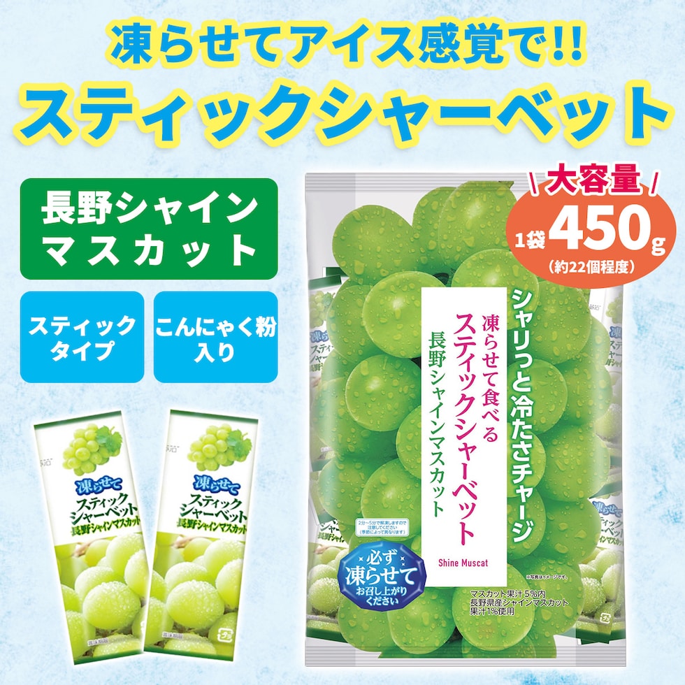 | 夏のデザートにぴったりのスティックシャーベットから、大容量450g入りが登場。冷凍庫で凍らせてアイス感覚で楽しめるので、夏休みのおやつにもぴったり。マスカット果汁(マスカット果汁5%内、長野県産シャインマスカット果汁1%)を使用しており、濃厚な味わいとなっております。吸い込まずにゆっくりと中身を押し上げてお召し上がりください。 |