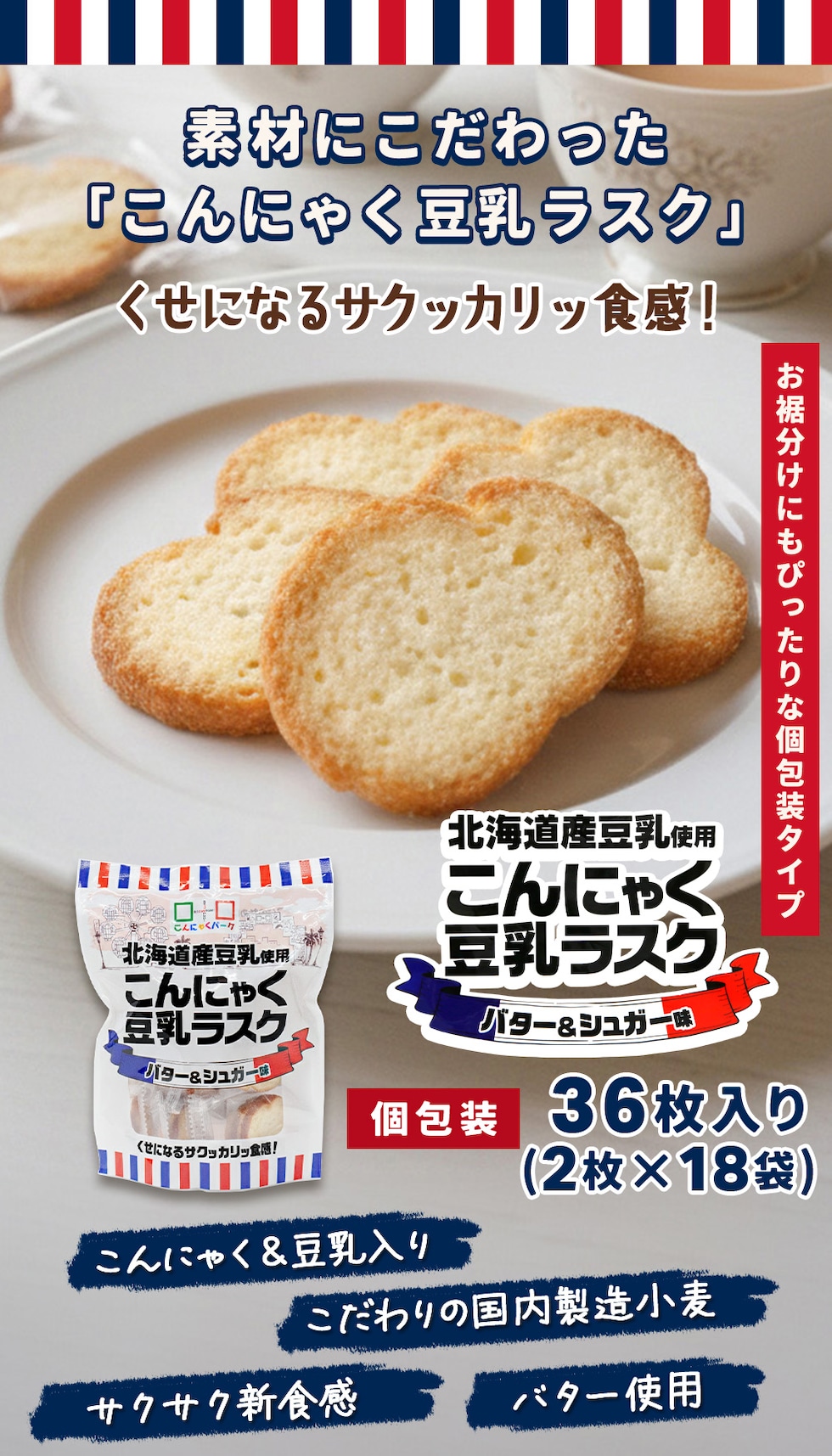 こんにゃく豆乳ラスク バター&シュガー味 北海道産豆乳使用 群馬県産こんにゃく粉使用 くせになるサクッカリッ食感 こんにゃくパーク ラスク 蒟蒻ラスク ヨコオデイリーフーズ 36枚入り(2枚×18袋)