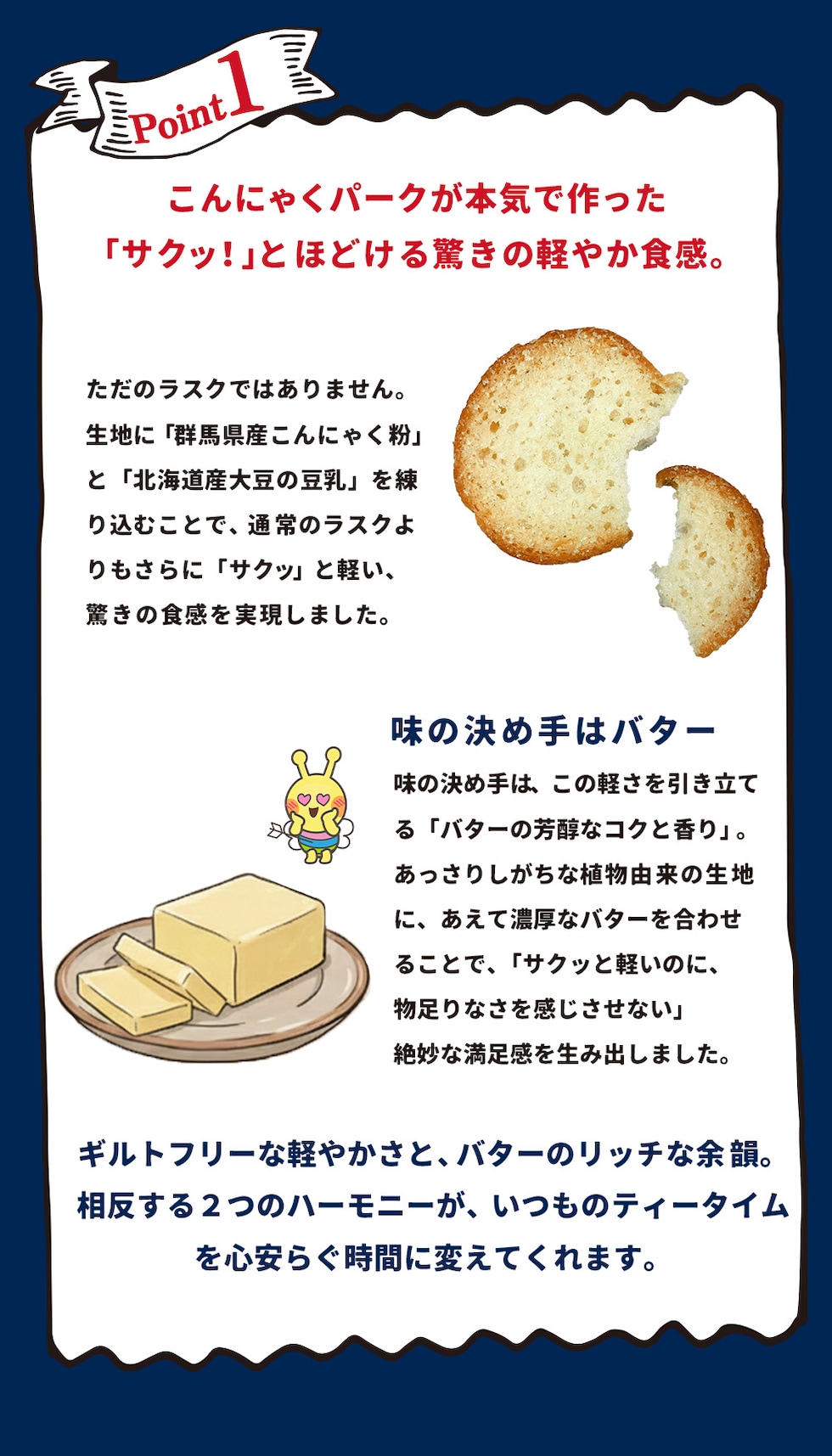 | くせになるサクッカリッ食感が魅力の素材にこだわった「こんにゃく豆乳ラスク」です。こんにゃくパークが本気で作った「サクッ!」とほどける驚きの軽やか食感を実現しました。 |