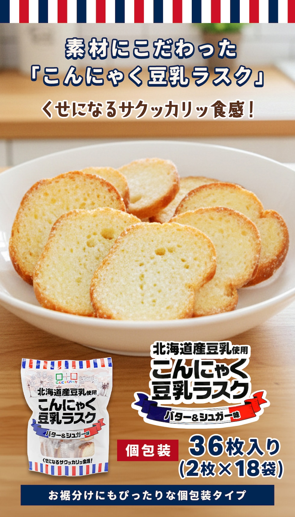 【5%OFF 4/11迄】こんにゃく豆乳ラスク バター&シュガー味 北海道産豆乳使用 群馬県産こんにゃく粉使用 くせになるサクッカリッ食感 こんにゃくパーク ラスク 蒟蒻ラスク ヨコオデイリーフーズ 36枚入り(2枚×18袋)