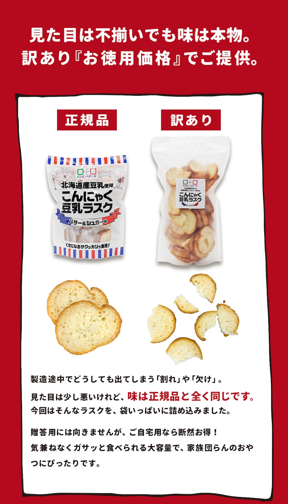 | くせになるサクッカリッ食感が魅力の素材にこだわった「こんにゃく豆乳ラスク」です。こちらは製造途中でどうしても出てしまう「割れ」や「欠け」などで、見た目は少し悪いけれど、味は正規品とまったく同じのラスクを袋一杯に詰め込んだ訳あり品です。 |