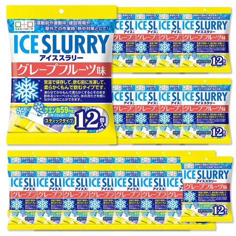 | 暑さが厳しい夏の熱中症対策にぴったりの「アイススラリー グレープフルーツ味」が登場。こちらは1袋12個入り。アイススラリーは、細かい氷の粒が液体に分散したシャーベット状飲料で、凍らせて飲むことで、体の内側から効率よくクールダウンできます。暑い屋外・作業中でもサッと飲むことができるスティックタイプで、常温保存が可能なため、倉庫やロッカーなどにストックも可能です。 |