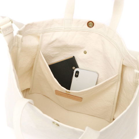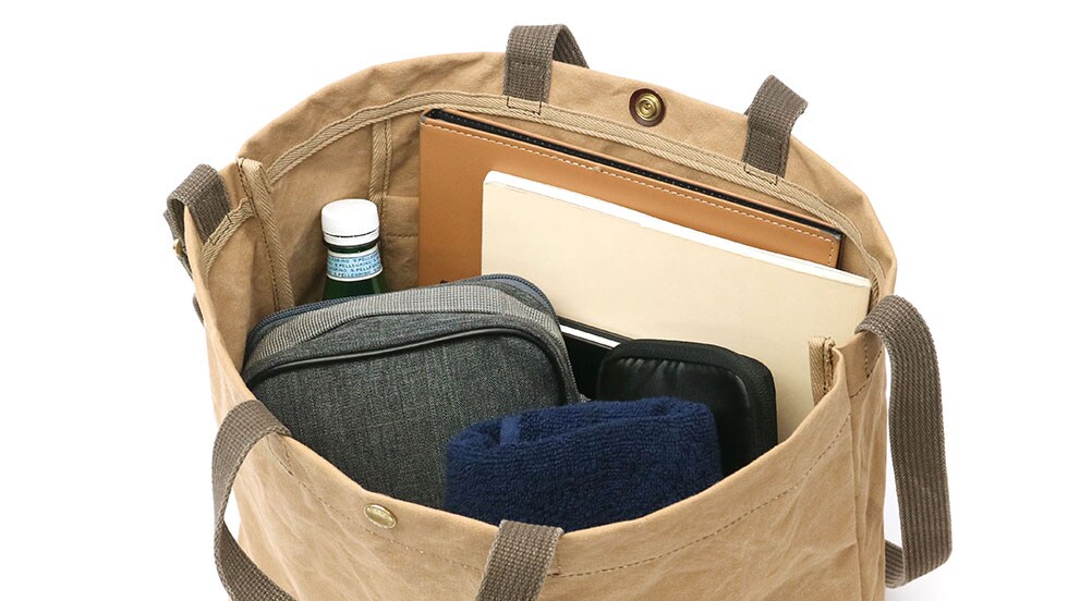 B4サイズに対応した収納部は、広々としたマチを設け荷物をざっくり収納可能。内部には小分けに便利なポケットも備わっているので、バッグの中で小物類を見失う心配もありません。スナップ仕様の開口部で、荷物をサッと出し入れできるところもポイントとなっています。