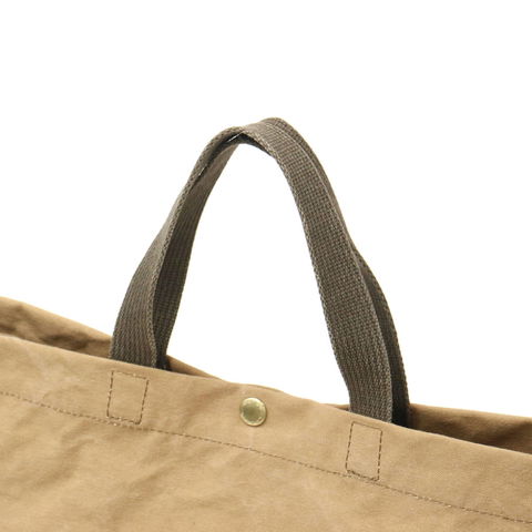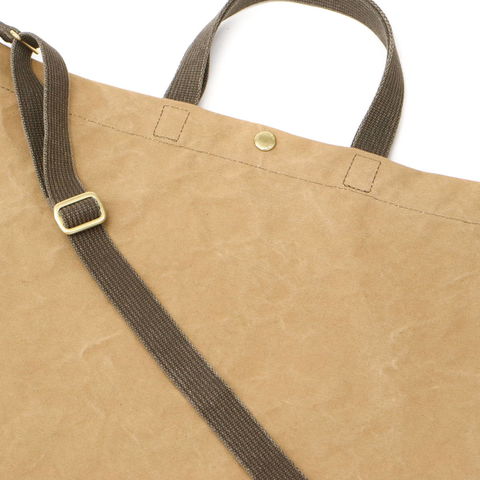 メイン素材には、岡山倉敷で織られた9号帆布をベースに、ベジタブルタンニンで染めた国産綿布を使用(ナチュラル色だけはタンニン染めではありません)。付属革はコードヴァンで有名なホーウィン社のクロムエクセルレザーを使用し、柔軟性や撥水効果を高める為に独自の天然オイルで仕上げています。