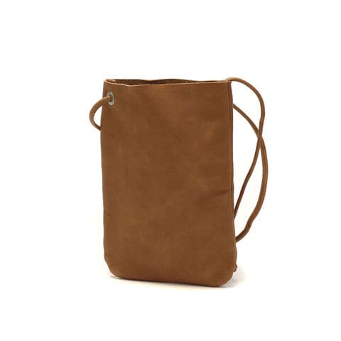 本体の前後にハトメを打ち、革紐を通したシンプルなデザインのショルダーバッグ。こちらはスマホやちょっとした小物類の収納に役立つミニマルなSサイズ。普段荷物の少ない方にはもちろん、サブバッグとして貴重品だけを持ち歩きたいときなどに重宝するアイテムです。