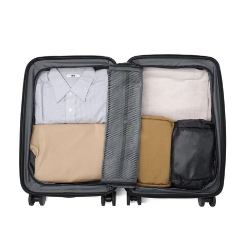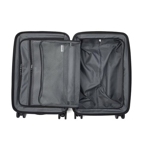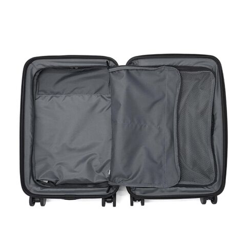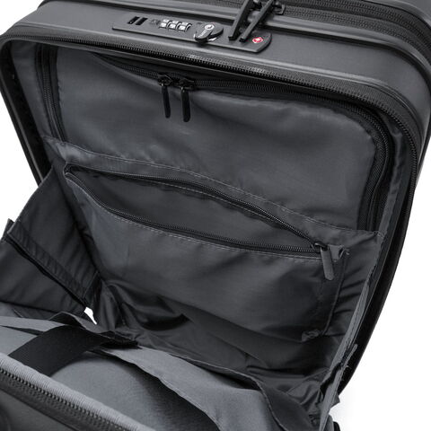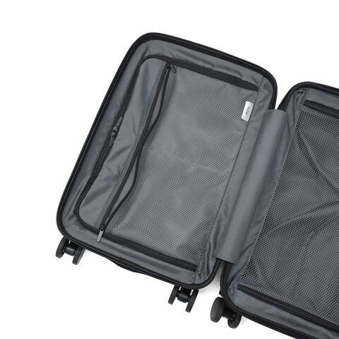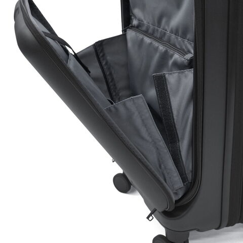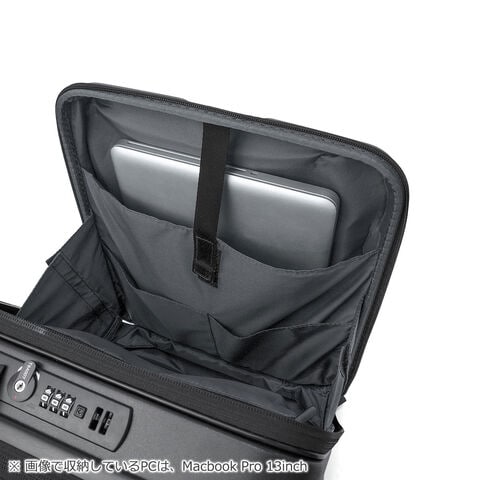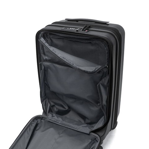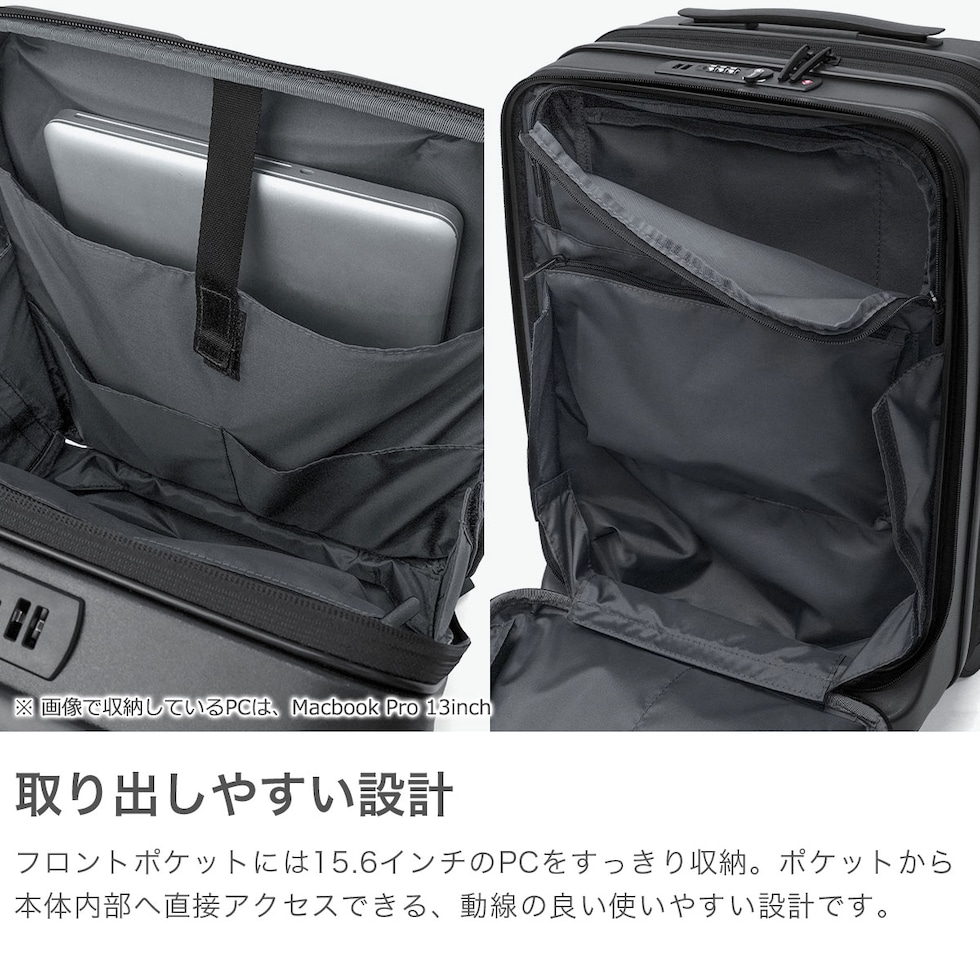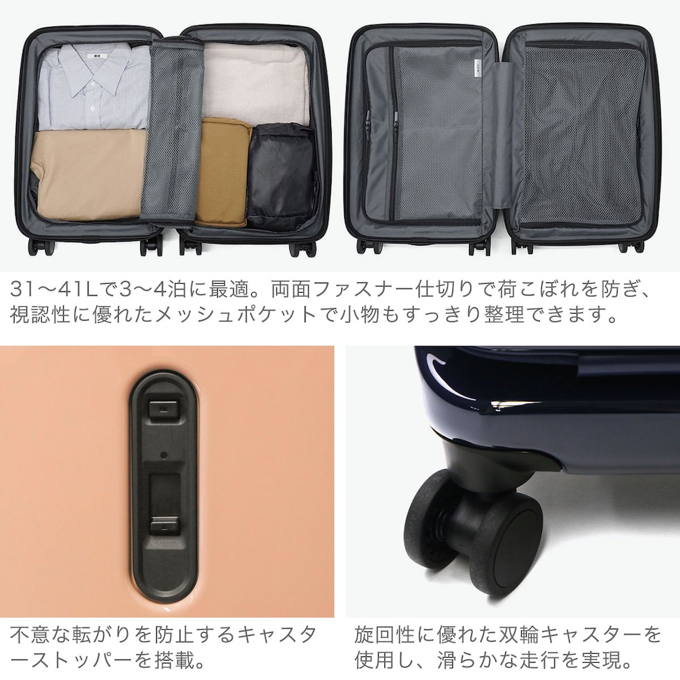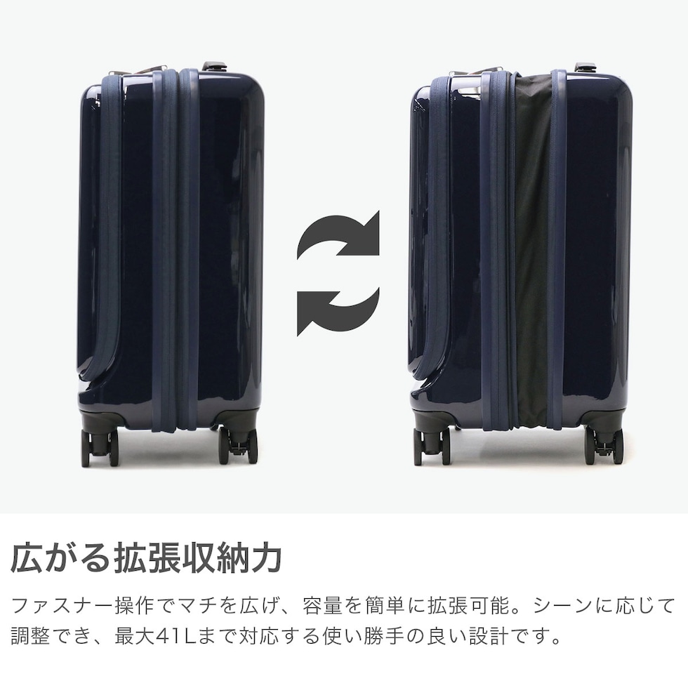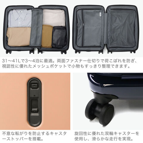 多機能なデザイン 出張から週末のお出掛けまで幅広く活躍する、洗練されたデザインの多機能スーツケース。こちらは、31Lから41Lに容量の拡張が可能なエキスパンダブル機能が備わり、3~5泊程度に対応した、機内持ち込み可能サイズです。フロントポケットにはPCが収納可能で、書類や小物の出し入れにも便利。キャスターロック機能付きで、坂道や電車内でも安心です。美しいフォルムと機能的な仕上がりで、快適な旅を演出してくれる仕上がりになっています。 |