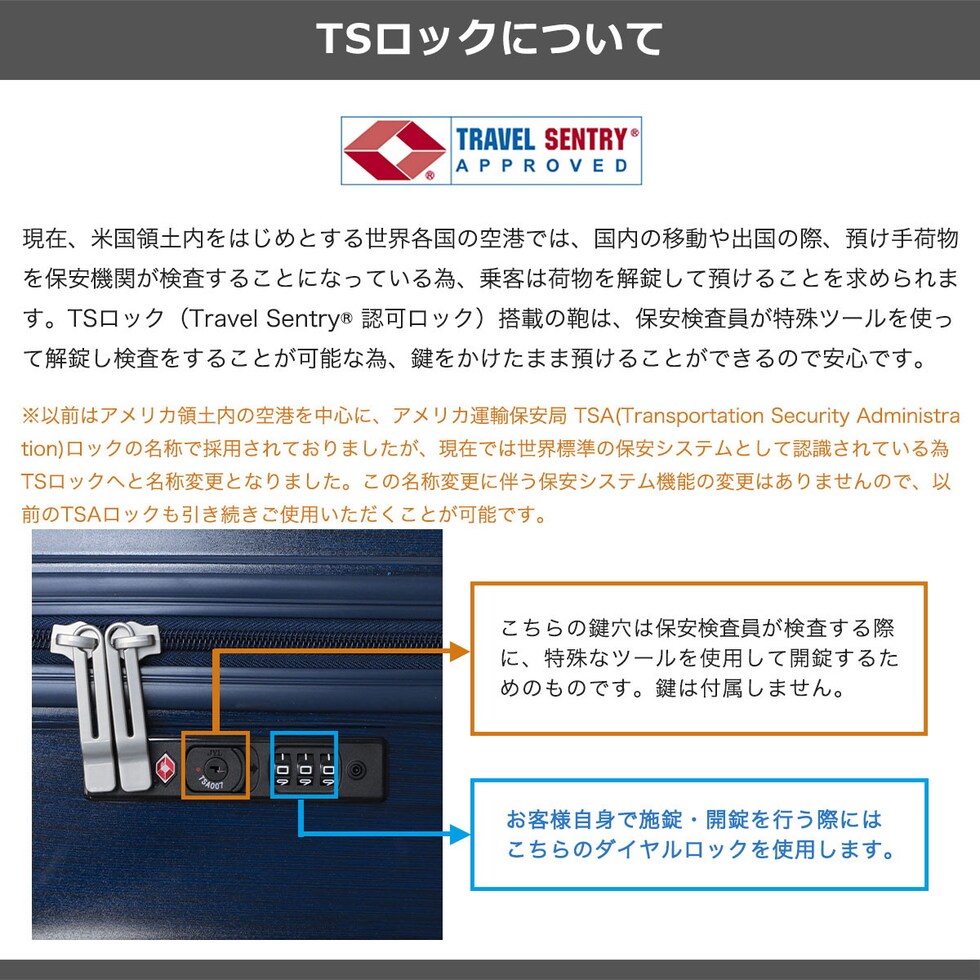 | シンプルを極めた ヘアラインの上質な輝き シンプルでスタイリッシュなデザインで、旅行はもちろん出張にもぴったりのスーツケース。5~7泊にちょうどいい使いやすいサイズ感がポイントです。旋回性に優れた双輪仕様やストッパー機能などの充実した装備で、使い勝手も抜群。電車や坂道での不意な走行を防ぐストッパー機能を搭載し、移動中も安心です。 |