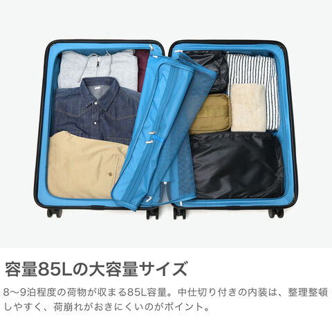 洗練された大人の旅へ シンプルでスタイリッシュなデザインで、旅行はもちろん出張にもぴったりのスーツケース。85Lの大容量サイズがポイントです。旋回性に優れた双輪仕様やストッパー機能などの充実した装備で、使い勝手も抜群。電車や坂道での不意な走行を防ぐストッパー機能を搭載し、移動中も安心です。 |